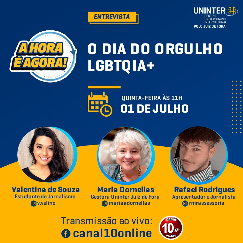 No mês do Orgulho LGBTQIA+, para divulgar sua importância e dar visibilidade à causa, promovendo a educação e evoluindo a discussão sobre gênero, sexualidade e respeito, o Polo Uninter Juiz de Fora (MG) abre uma discussão ao vivo nesta quinta-feira, 1° de julho, às 11h, com a gestora Maria Dornellas, o jornalista Rafael Rodrigues e a ativista trans e estudante de Jornalismo Valentina de Souza. A produção terá como frente o Canal 10 WebTV e o produtor Leonardo Pedroso.