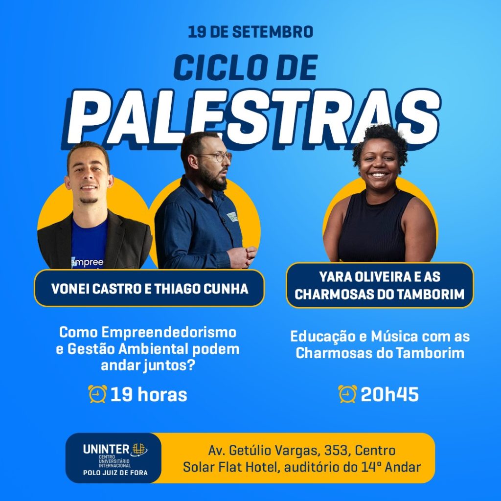 O polo da Uninter de Juiz de Fora (MG) promove um ciclo de palestras presenciais sobre diversos temas, incluindo empreendedorismo, gestão e cultura. O evento acontece na quinta-feira (19), às 19h, no Solar Flat Hotel, auditório do 14º andar. A participação é gratuita e contará com os palestrantes Thiago Cunha, Vonei Castro, Yara Oliveira e as Charmosas do Tamborim.