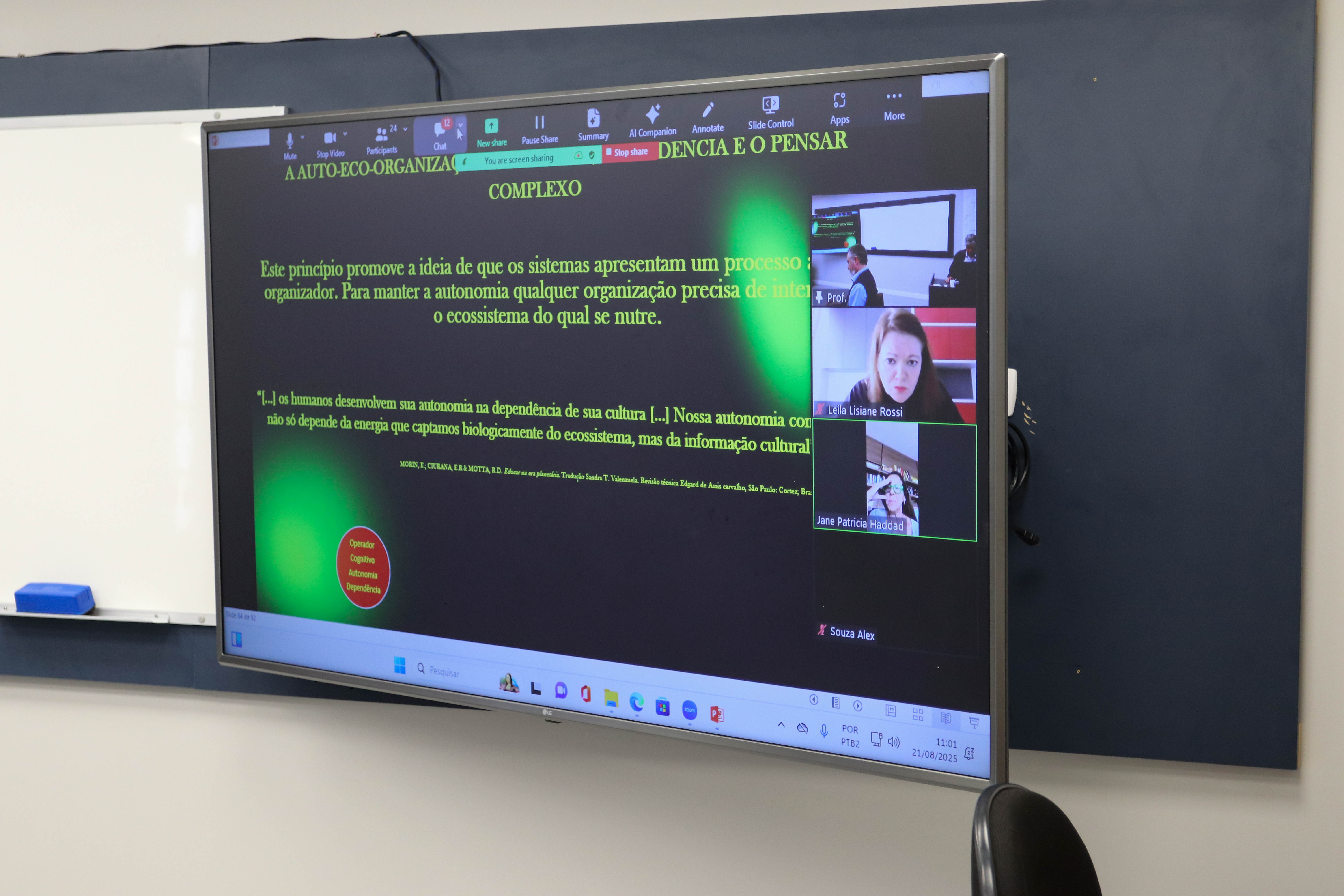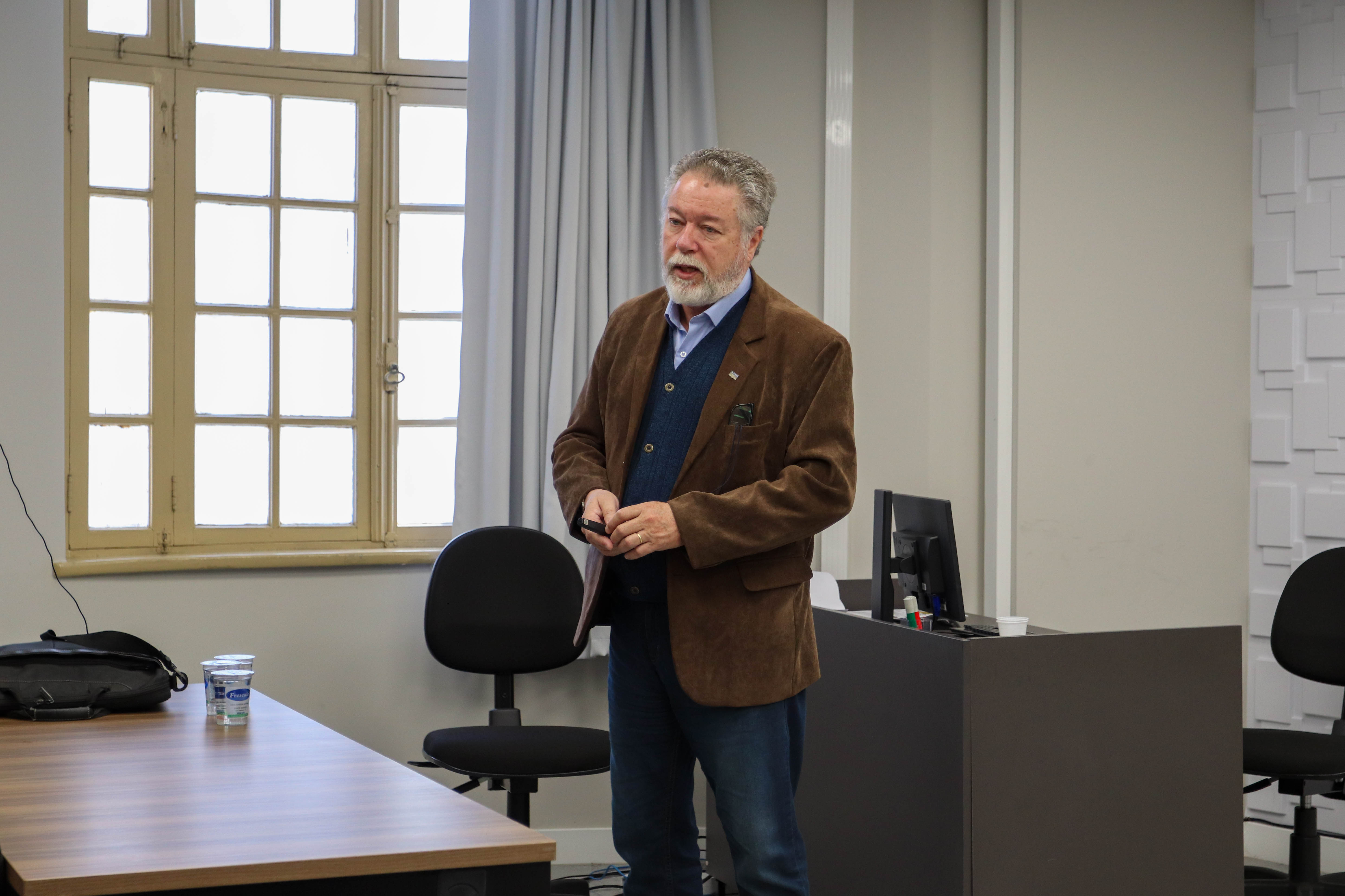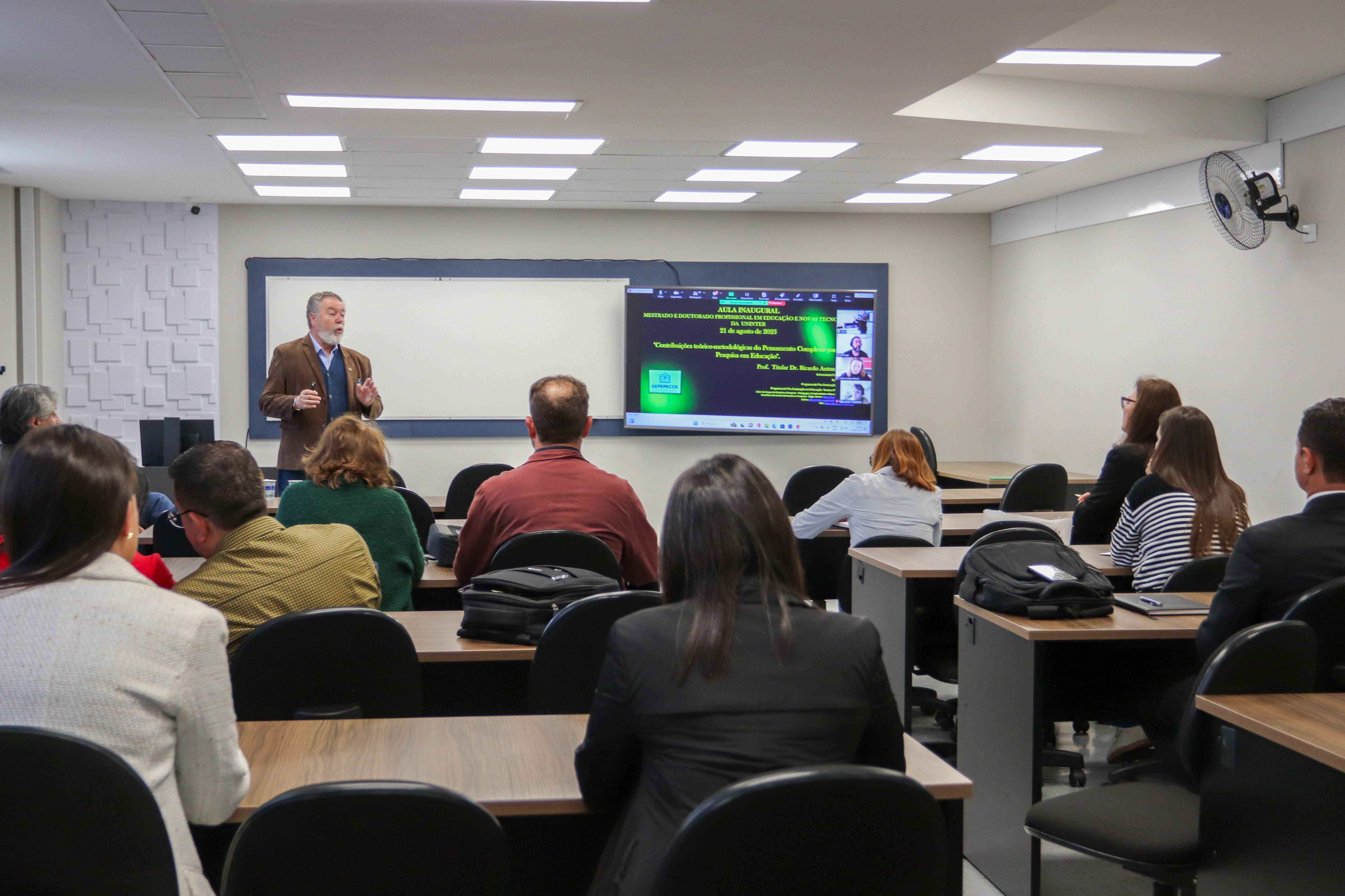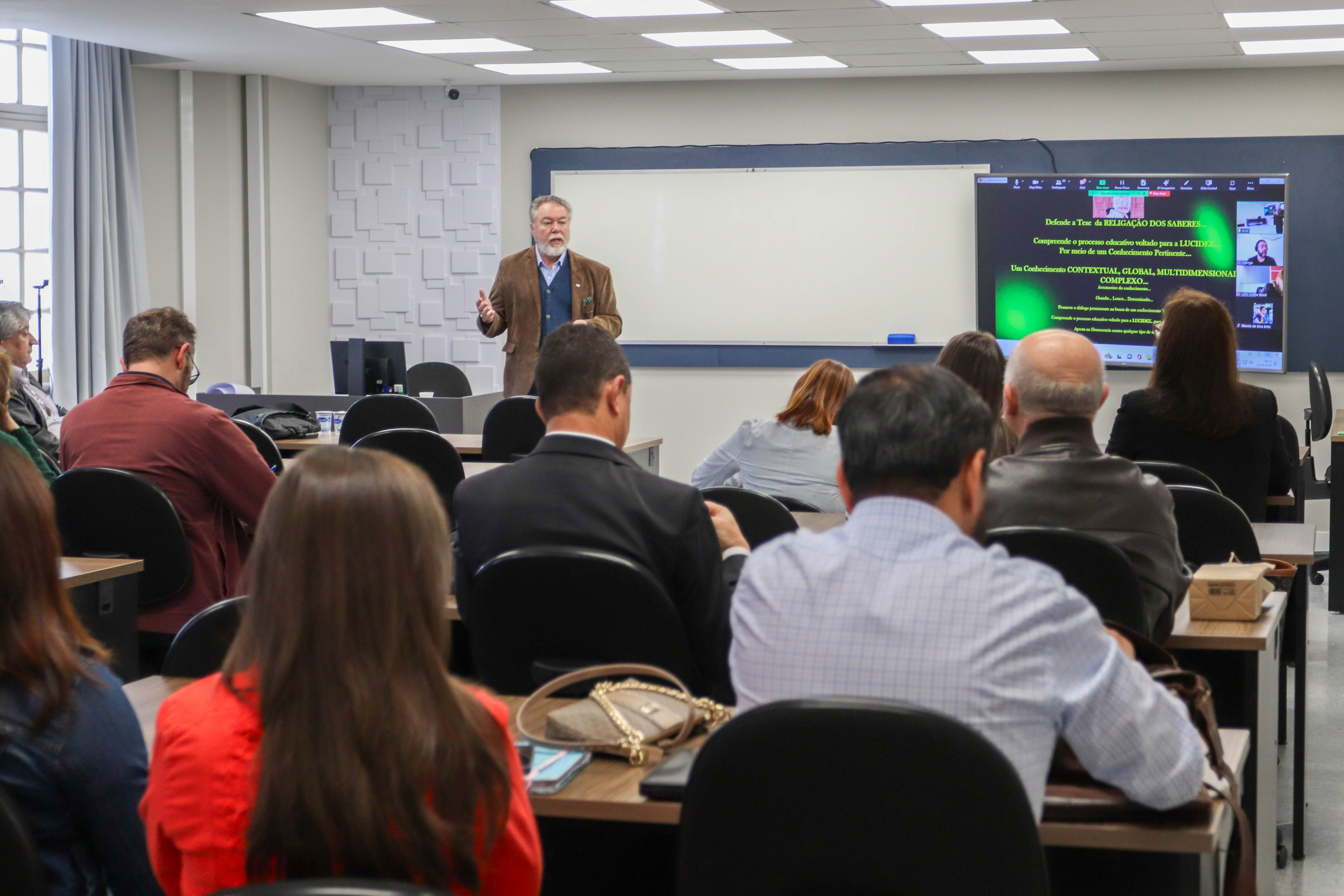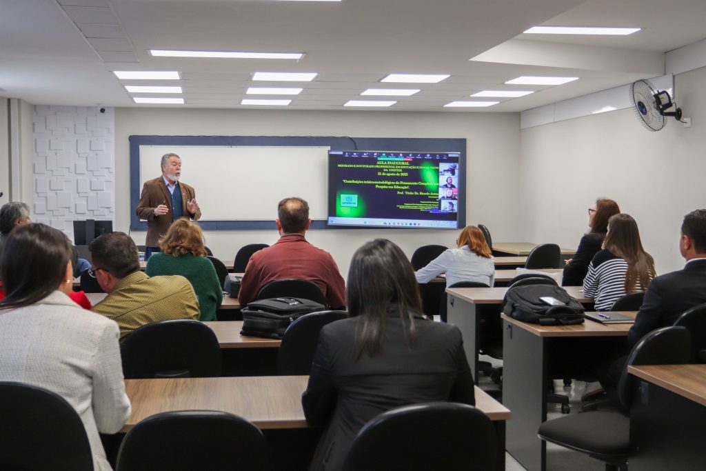 Docentes e pesquisadores do mestrado e doutorado participaram da aula ministrada pelo doutor em Educação Ricardo Antunes de Sá, professor aposentado do setor de Educação da Universidade Federal do Paraná (UFPR), que continua como voluntário sênior do Programa de Pós-graduação em Educação (PPGE) e mestrado profissional da instituição pública, líder do Grupo de Estudos e Pesquisa Pedagogia Complexidade e Educação.