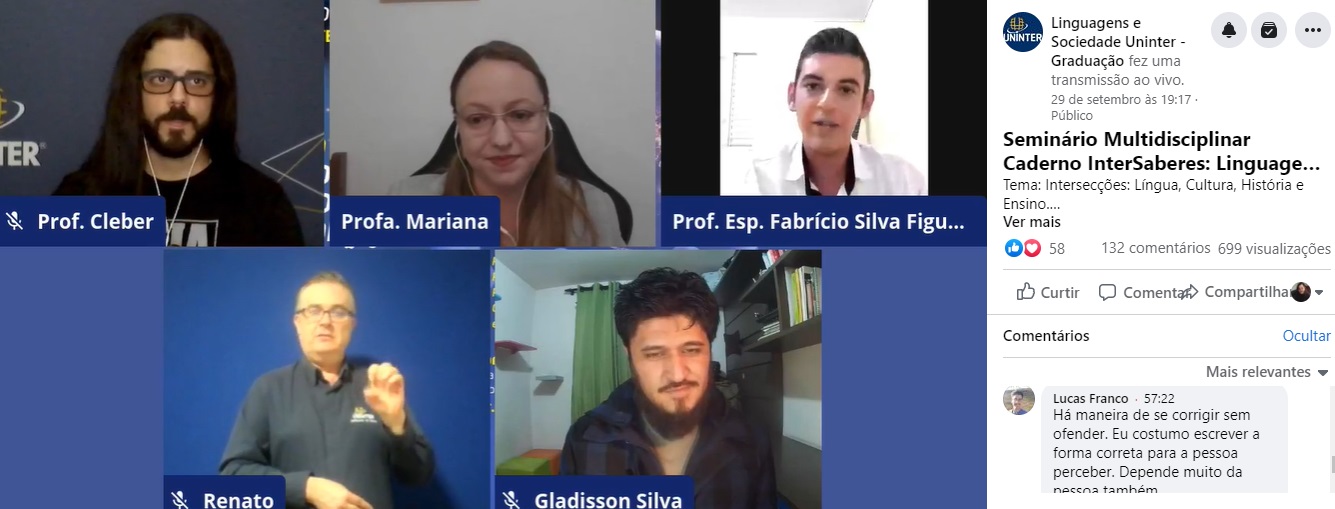 Professores, estudantes e egressos debateram acerca dos temas desenvolvidos durante a primeira noite do Seminário Multidisciplinar Caderno Intersaberes da área de Linguagens e Sociedade, com participação via chat de toda a comunidade que acompanhava o evento ao vivo. O bate-papo continua disponível para acesso para os interessados.