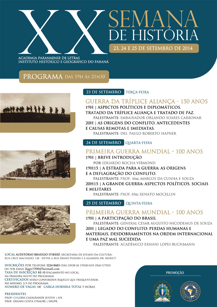 Entre os dias 23 e 25 de setembro acontece a XX Semana de História, uma parceria da Academia Paranaense de Letras com o Instituto Histórico e Geográfico do Paraná. O professor do Centro Universitário Internacional UNINTER Marcos Souza vai discutir A estrada para a guerra: as origens e deflagração do conflito.