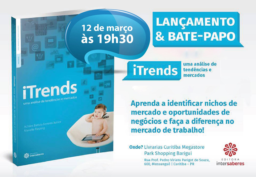 O coordenador de pós-graduação em Administração e Marketing, na modalidade a distância (EAD), do Centro Universitário UNINTER, Achiles Batista Ferreira Junior, em parceria com a professora Marielle Rieping, lançará seu quinto livro no dia 12 de março, às 19h30, na Livrarias Curitiba do Shopping Barigui, em Curitiba (PR).  O livro trás como título iTrends uma análise de tendências e mercados.