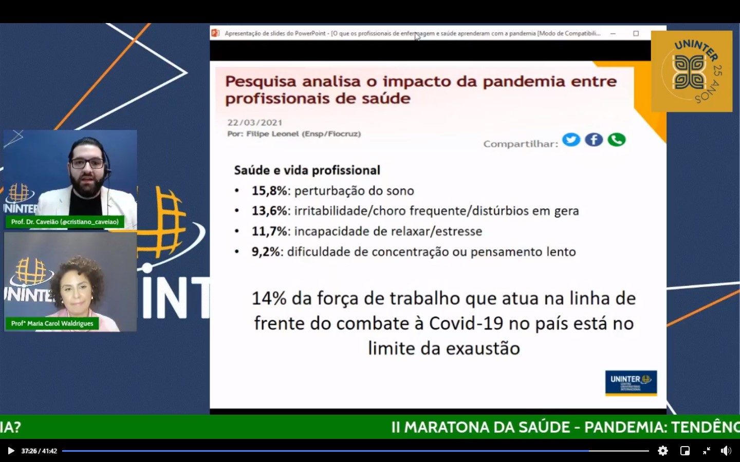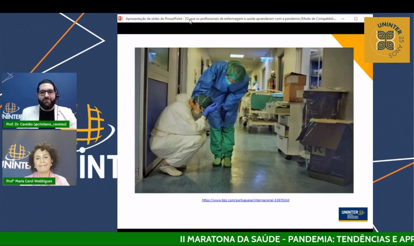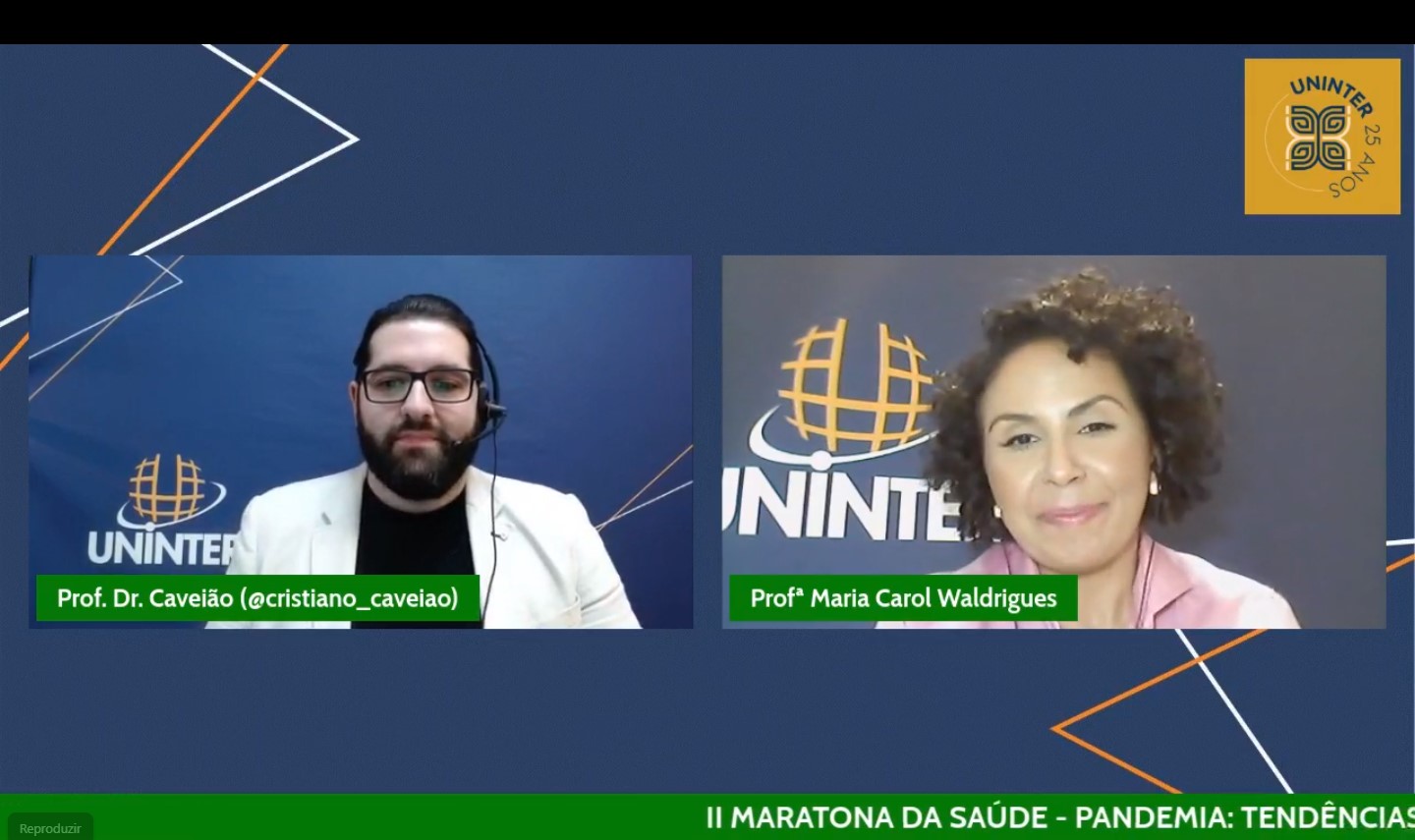 A Escola de Saúde, Biociência, Meio Ambiente e Humanidades da Uninter promoveu no último dia 30.abr.2021 a 2ª Maratona de Saúde. Foram 12 horas de palestras com muito conteúdo e conhecimento sobre temas atuais. Na live “O que os profissionais de enfermagem e saúde aprenderam com a pandemia?”, os professores Cristiano Caveião e Maria Carol Waldrigues discutiram sobre os desafios e o desgaste emocional dos enfermeiros em meio ao contexto pandêmico de Covid-19.