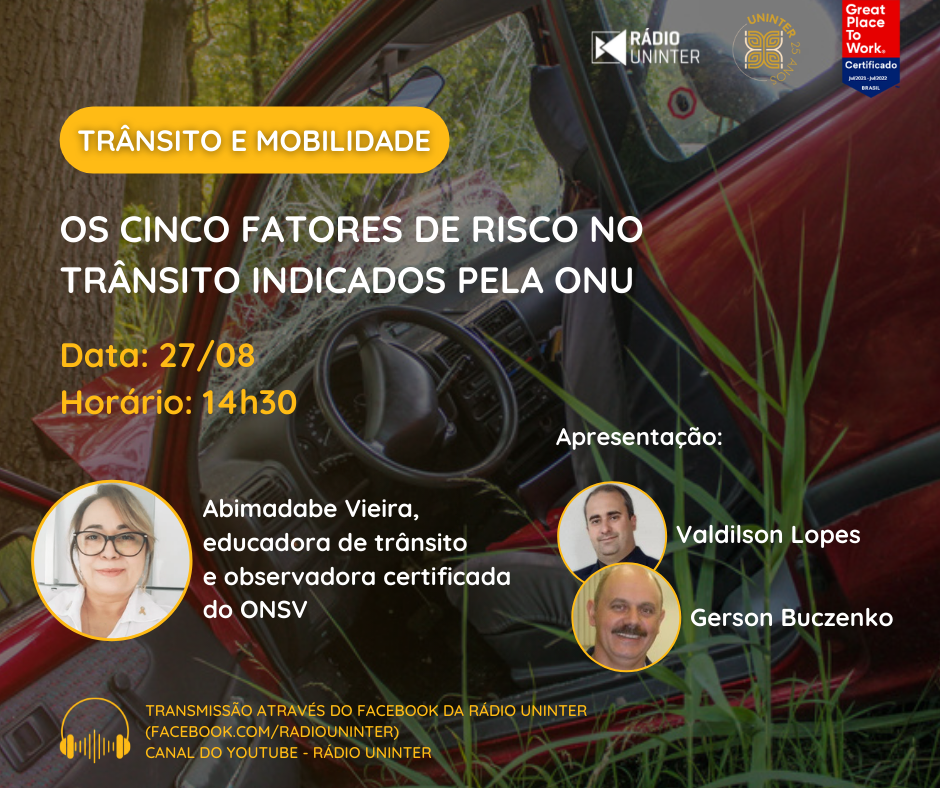 Nesta sexta-feira, 27 de agosto, a Rádio Uninter irá transmitir às 14h30 o 29º episódio do programa Trânsito e Mobilidade, e o tema desta edição irá abordar “Os cinco fatores de risco no trânsito indicados pela ONU”. A transmissão será ao vivo pelo Facebook e Youtube da Rádio Uninter.