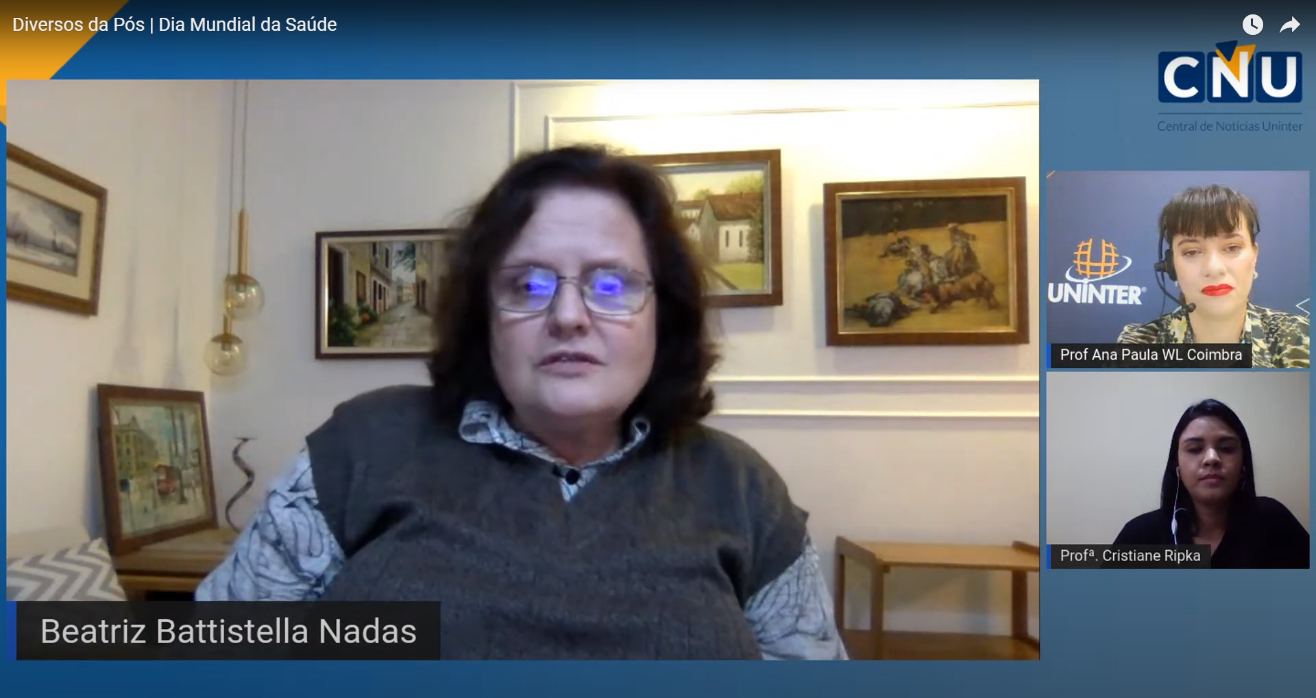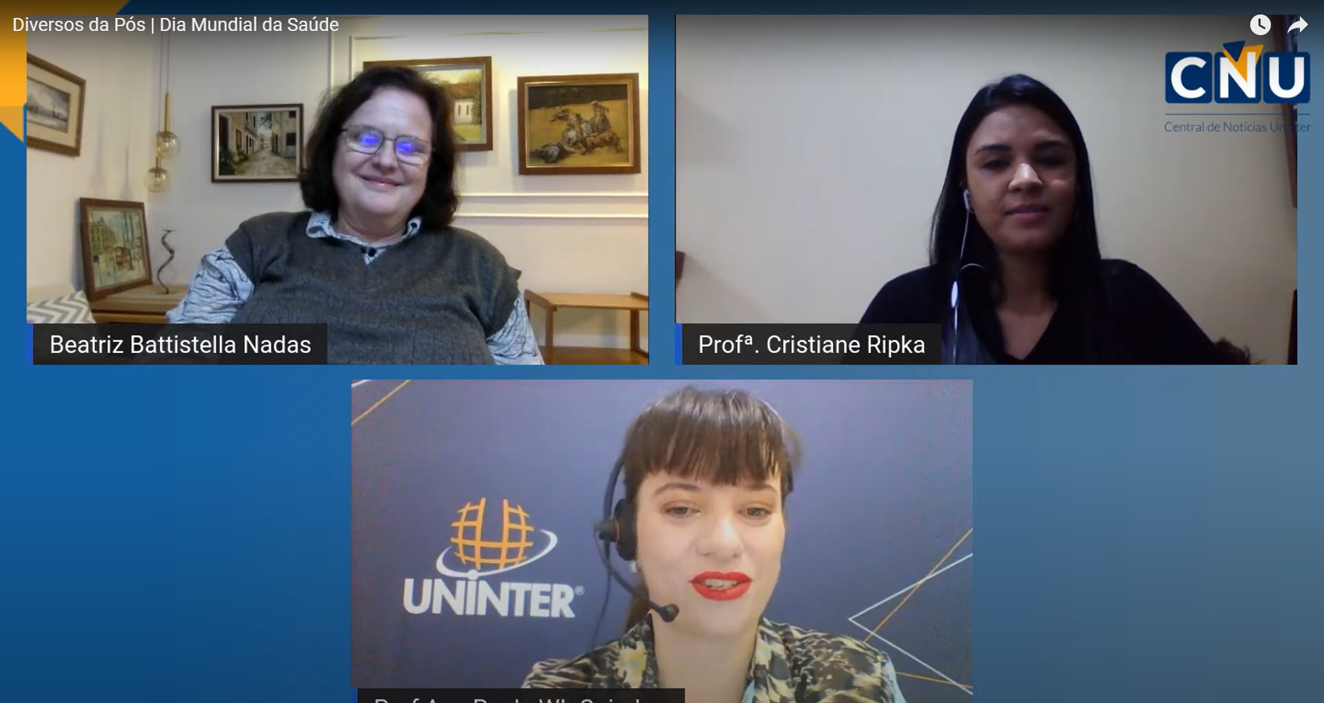 Em comemoração ao Dia Mundial da Saúde, 07 de abril, o programa Diversos da Pós, da Rádio Uninter, recebeu a convidada Beatriz Battistella Nadas, nova secretária de saúde da cidade de Curitiba, que assumiu o cargo dia 01 de abril. Nadas falou sobre os desafios da gestão da saúde pública e a importância do Sistema Único de Saúde (SUS) na pandemia de Covid-19. A edição foi apresentada pela tutora dos cursos de Logística e Qualidade da pós-graduação, Cristiane Ripka, e pela coordenadora dos cursos da área da saúde da pós-graduação, Ana Paula Coimbra.