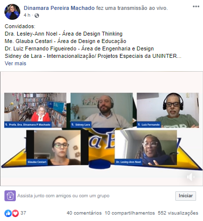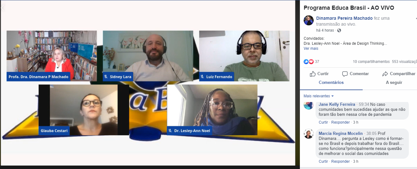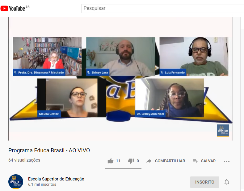 O programa Educa Brasil é transmitido ao vivo toda terça-feira às 17h pelo YouTube, no canal da Escola Superior de Educação (ESE) da Uninter, e também na página do Facebook da professora Dinamara Machado, diretora da ESE. Uma série de lives estão sendo realizadas neste novo momento do programa, com assuntos relacionados à mudança global que tem acontecido devido à pandemia da Covid-19. Nesta semana, Dinamara conduziu o bate-papo com os professores Sidney de Lara, Luiz Fernando Figueiredo, Glauba Cestari e Lesley-Ann Noel.