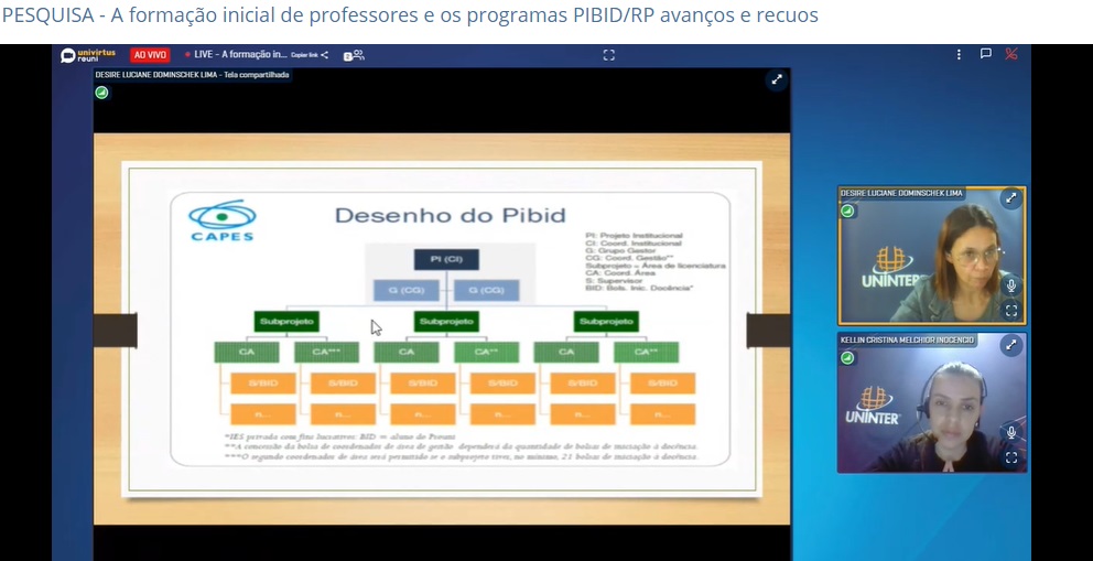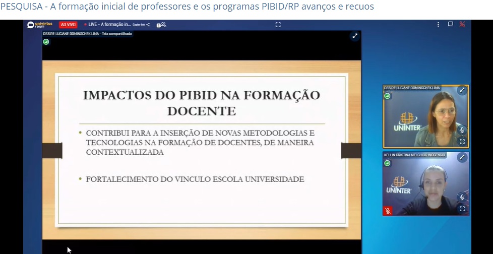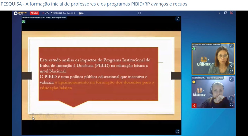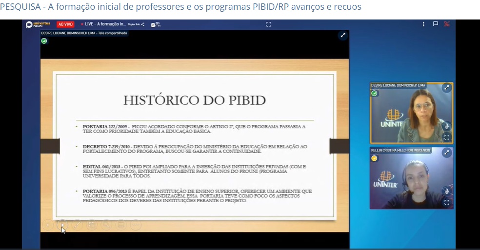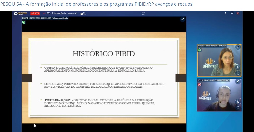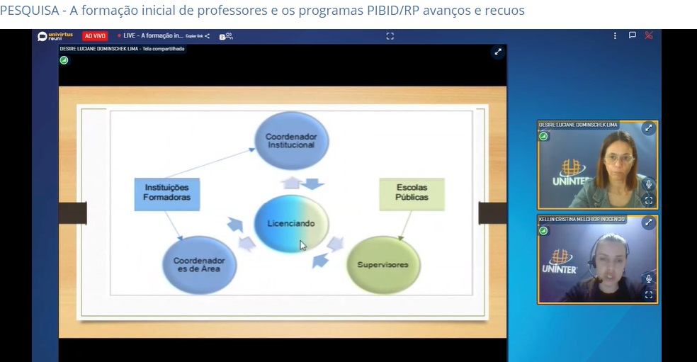 As docentes debateram sobre os programas e o projeto de pesquisa em uma transmissão realizada através do Ambiente Virtual de Aprendizagem (AVA) Univirtus, para alunos que se inscreveram previamente. A Uninter segue com o PIBID mesmo durante o distanciamento social. De acordo com Desiré, novos editais para a seleção de alunos serão divulgados em breve, através das mídias sociais. Siga a página do Facebook e acompanhe.