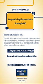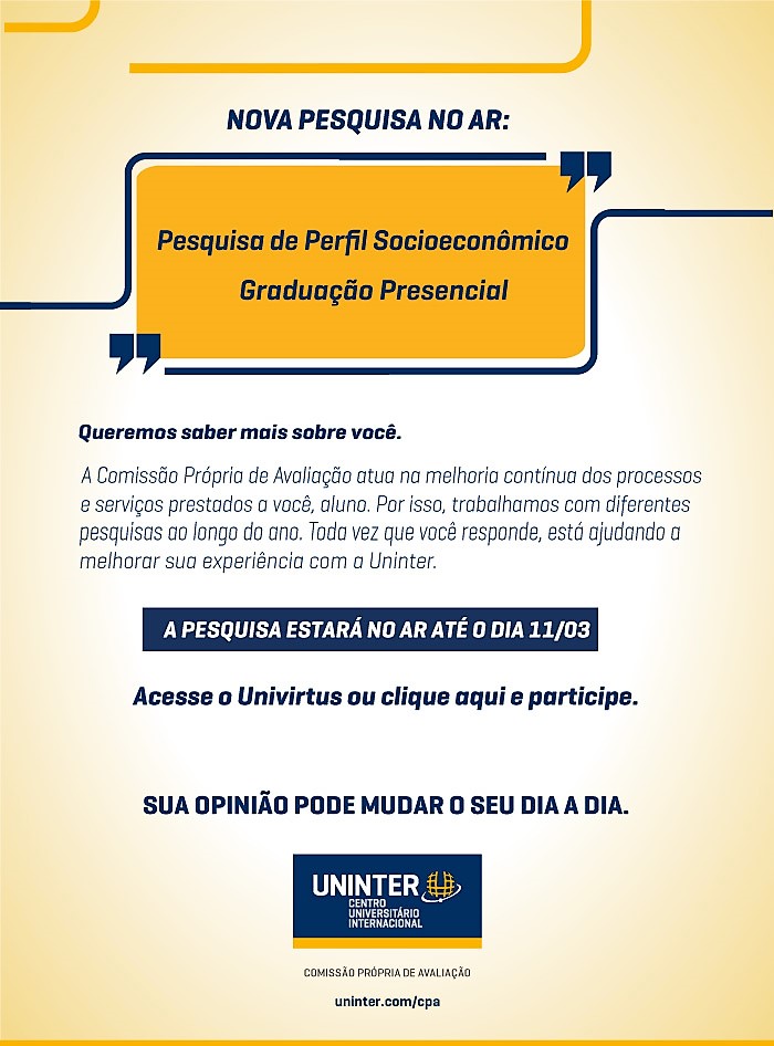 A pesquisa é objetiva e cada uma das questões tem um conjunto de alternativas fechadas, dinâmica diferente das questões discursivas que possuem espaço para comentário. O estudante terá o questionário disponível até o dia 11 de março no Ambiente Virtual de Aprendizagem (AVA). Uma mensagem sobre a pesquisa aparecerá na tela assim que o aluno entrar no sistema com o seu RU e senha. A participação de cada um é importante porque assim a Uninter poderá fazer os ajustes necessários para atender às necessidades dos alunos.