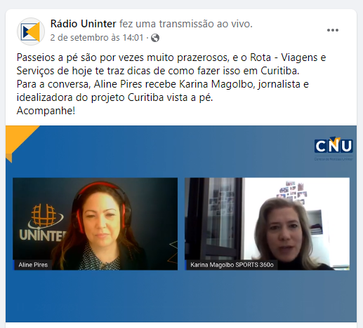 Karina Magolbo foi a convidada especial da última edição do programa Rota – Viagens e Serviços, no dia 2 de setembro, apresentado pela professora do curso tecnólogo de Gestão de Turismo Aline Pires e transmitido pela Rádio Uninter.