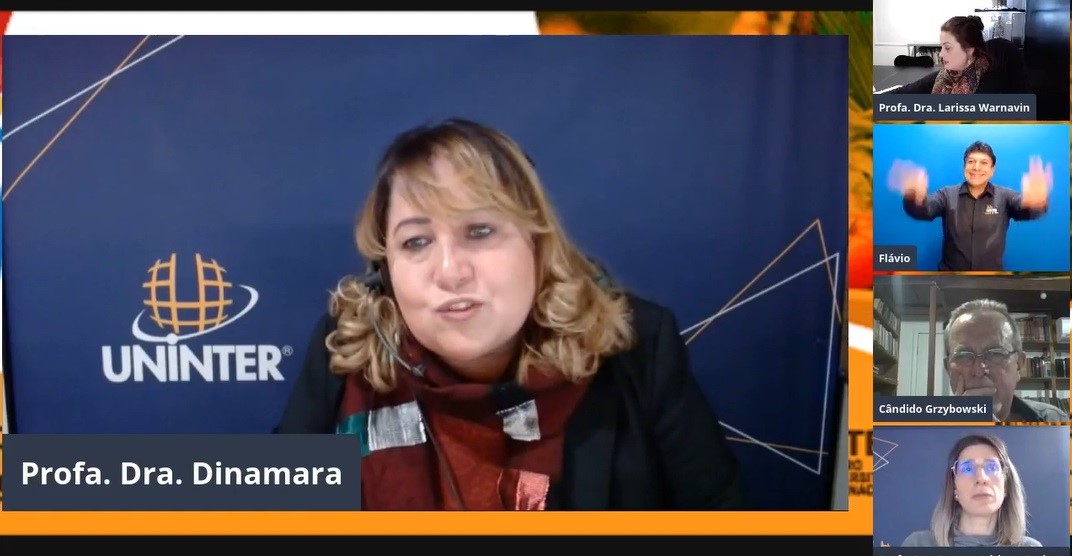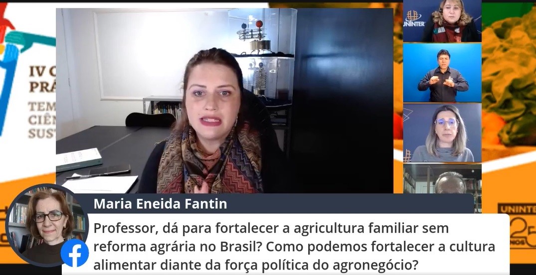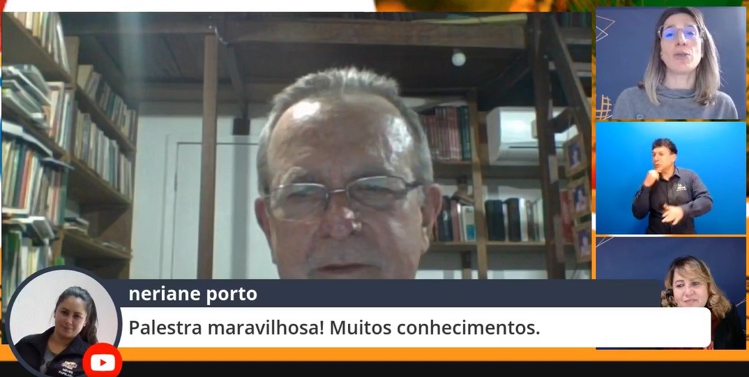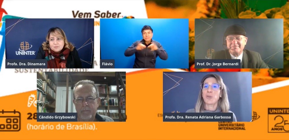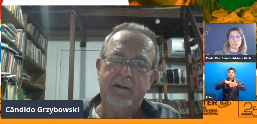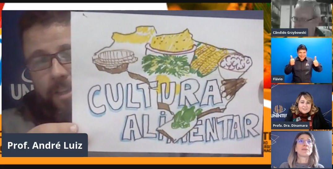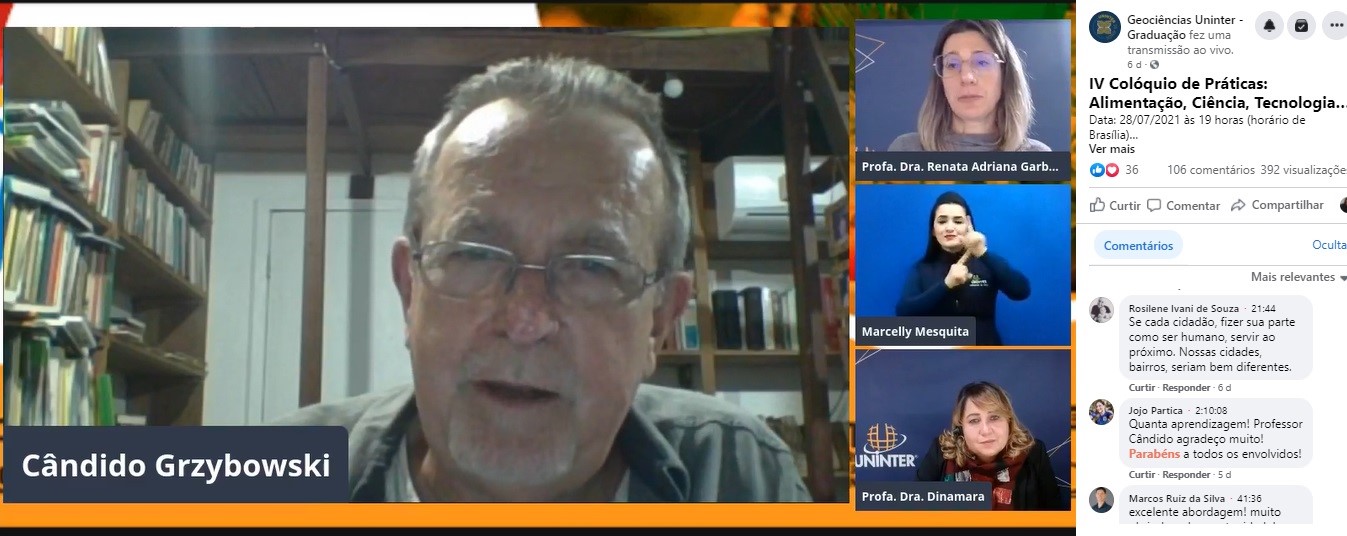 Cândido Grzybowski debateu Alimentação, ciência, tecnologia e sustentabilidade no primeiro dia do 4º Colóquio de Práticas da ESE, realizado em 28 e 29.jul.2021. Na ocasião, pôde sanar dúvidas de profissionais e estudantes que acompanhavam ao vivo, com mediação das professoras Renata Garbossa, Larissa Warnavin e a diretora da ESE, Dinamara Machado. Na primeira noite, o professor André Luiz Santos, do curso de Artes Visuais, também realizou ilustrações sobre os assuntos abordados. O tema discutido nos dois dias de apresentações norteia o portfólio que será desenvolvido pelos graduandos nos próximos meses.