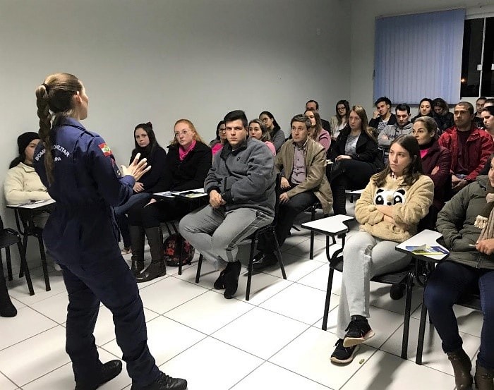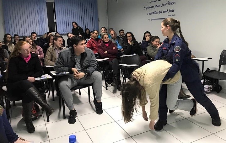 Uma das atividades que os alunos tiveram foi com a bombeira militar de Santa Catarina Cassiane Zappani, intitulada “Primeiros Socorros: técnicas que salvam vidas!”. Ela falou sobre primeiros socorros e demonstrou como aplicar algumas técnicas de salvamento para situações de emergência.