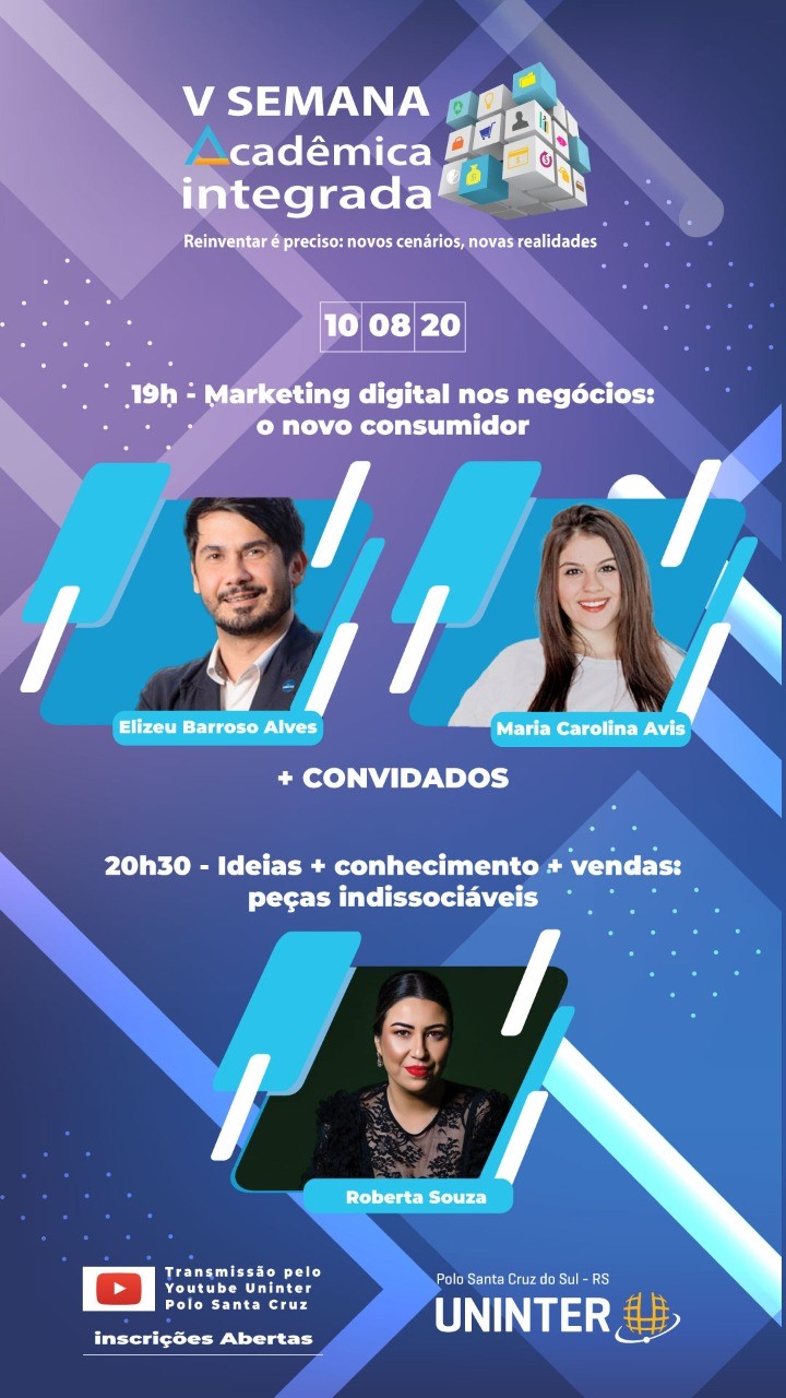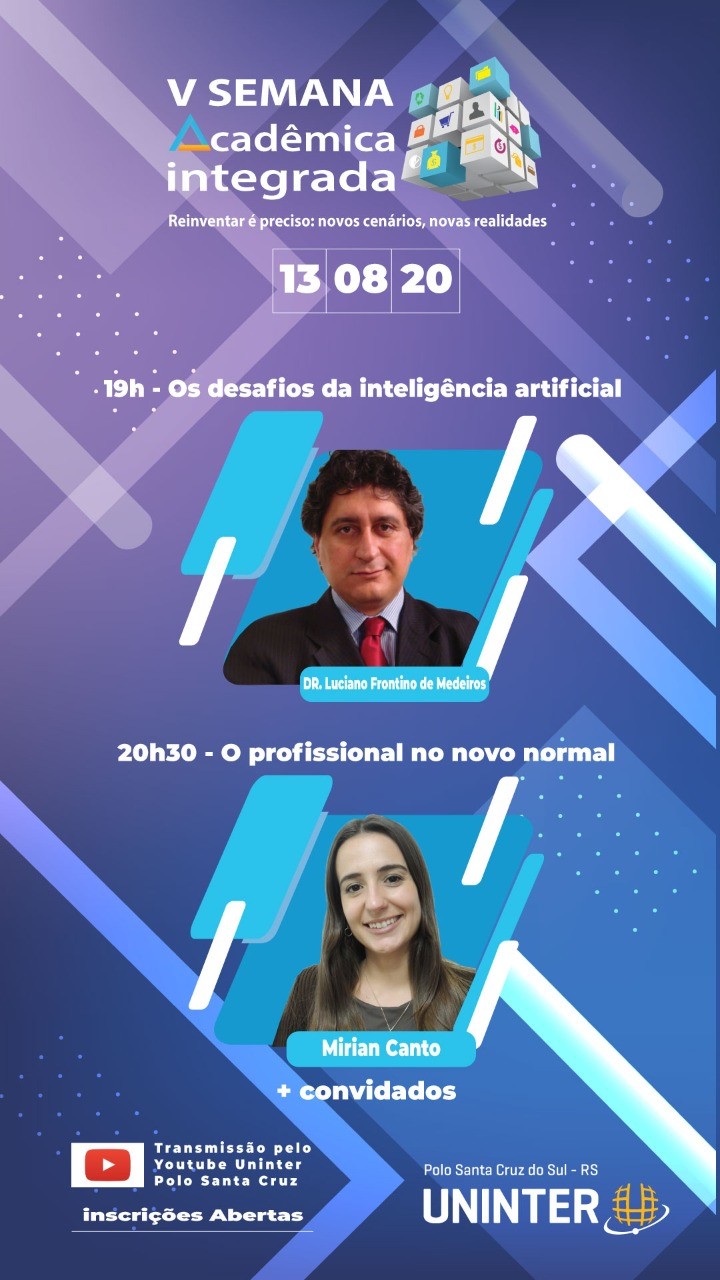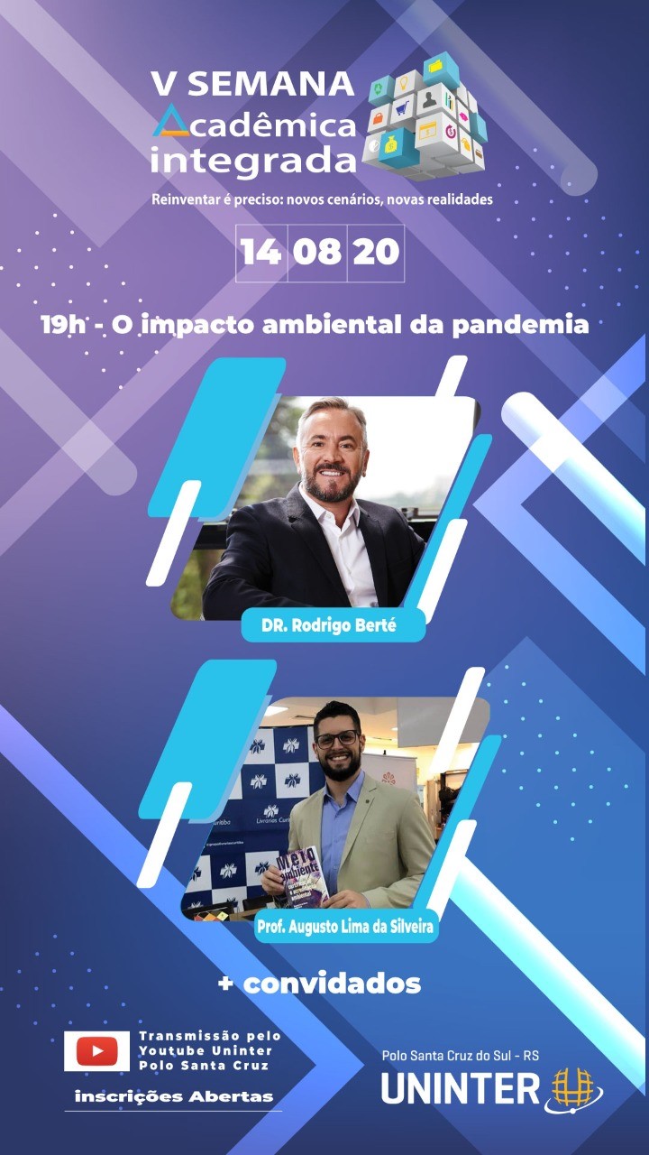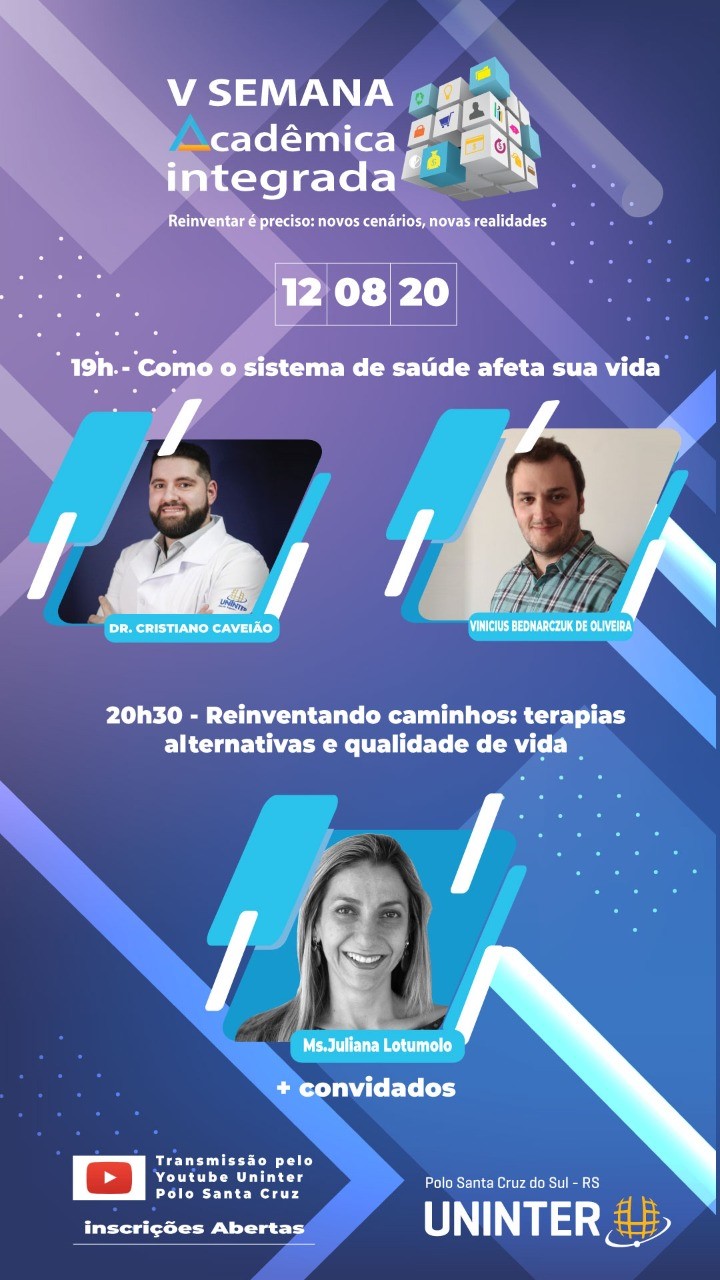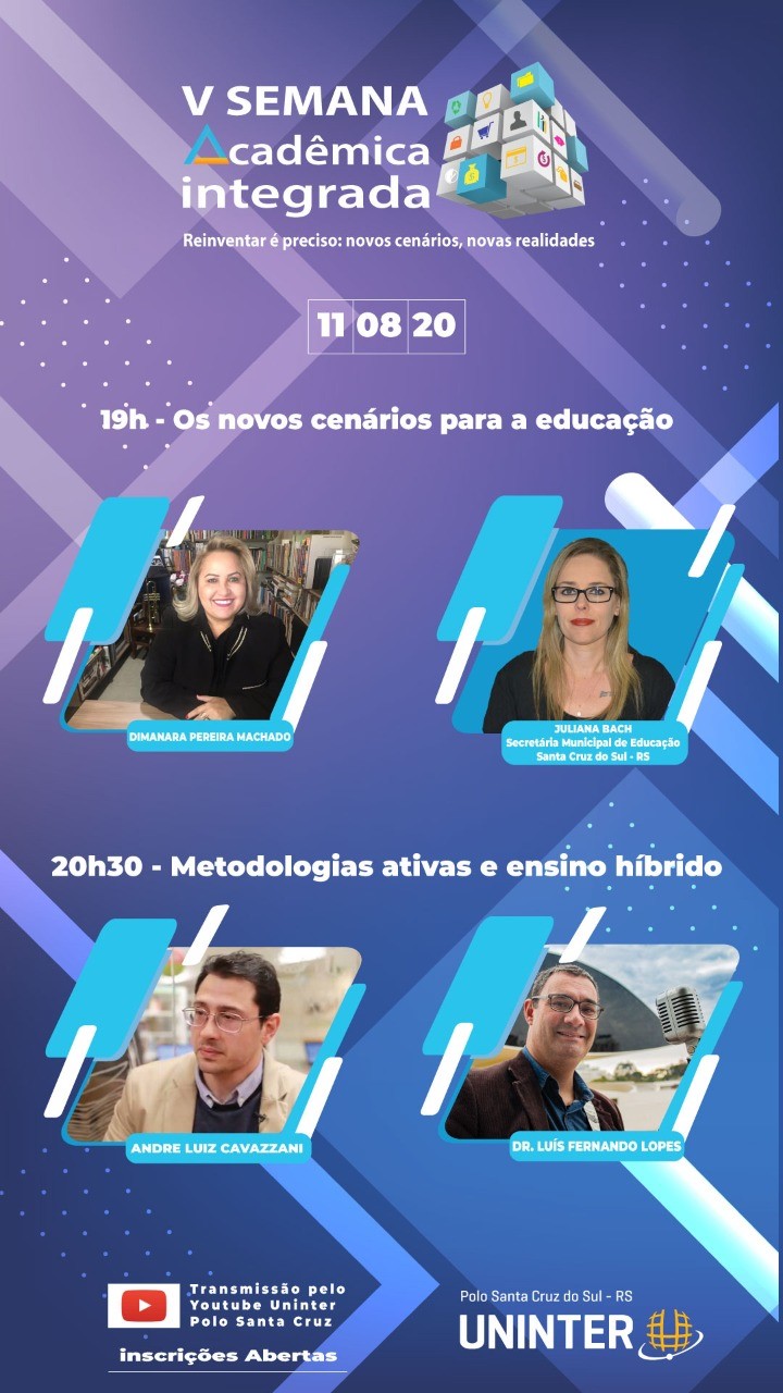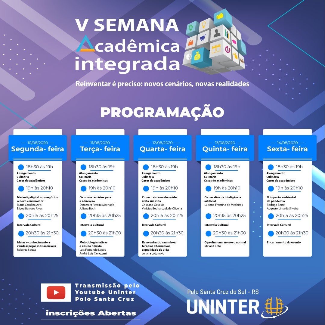 Em transmissão online gratuita para todo o Brasil, a 5ª Semana Acadêmica Integrada da Uninter terá como tema “Reinventar é preciso: novos cenários, novas realidades”. O objetivo do evento é dialogar sobre como se reinventar na educação, no trabalho, nos negócios, na saúde e meio ambiente no cenário de pandemia. A transmissão será ao vivo pelo YouTube do polo de Santa Cruz do Sul (RS). Ao todo, serão cinco dias de evento, entre os dias 10.ago.2020 e 14.ago.2020, sempre a partir das 18h30.