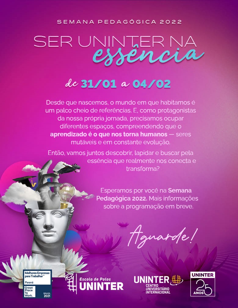 A Uninter inicia na próxima segunda-feira (31/01) a Semana Pedagógica 2022. O evento, com transmissão completamente online, tem o objetivo de aproximar professores e colaboradores de questões pertinentes e contemporâneas da educação, com foco na humanização e no aprendizado. As palestras e mesas-redondas vão até o dia 4 de fevereiro, visando a atingir todas as equipes acadêmicas, totalizando cerca de 850 profissionais.