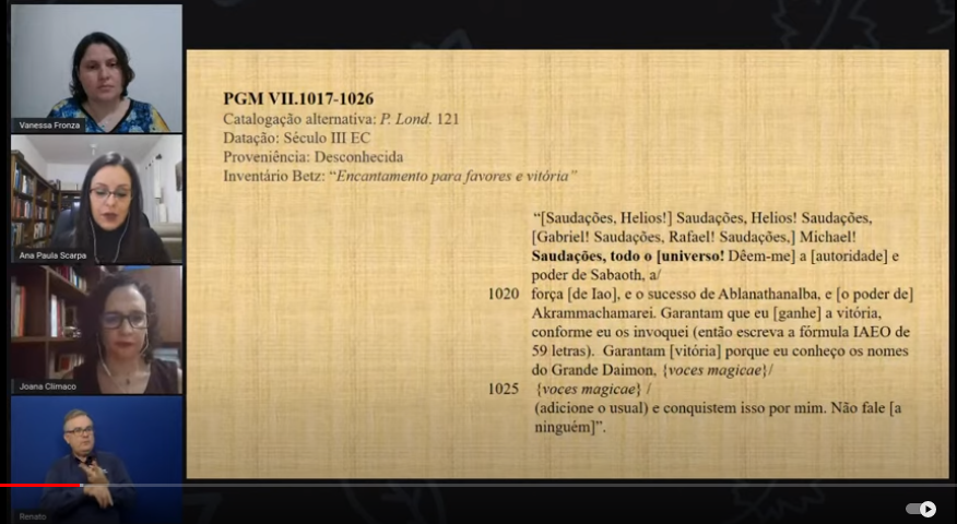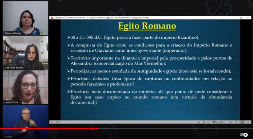 Ana Paula Scarpa e Joana Campos Clímaco debateram sobre suas pesquisas acadêmicas na mesa-redonda O Egito Romano – Entre Práticas e Representações, mediada pela professora da área de Linguagens e Sociedade da Uninter Mariana Bonat Trevisan, e pela professora do Instituto Federal de Rondônia (IFRO) Vanessa Fronza.