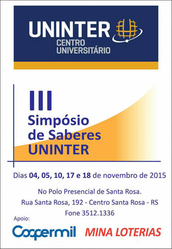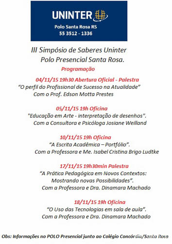 O polo do Centro Universitário Internacional UNINTER em Santa Rosa (RS), promove nos dias 04, 05, 10, 17 e 18 de novembro o III Simpósio de Saberes. Aberto ao público, o evento reúne palestras e oficinas sobre educação e profissões.