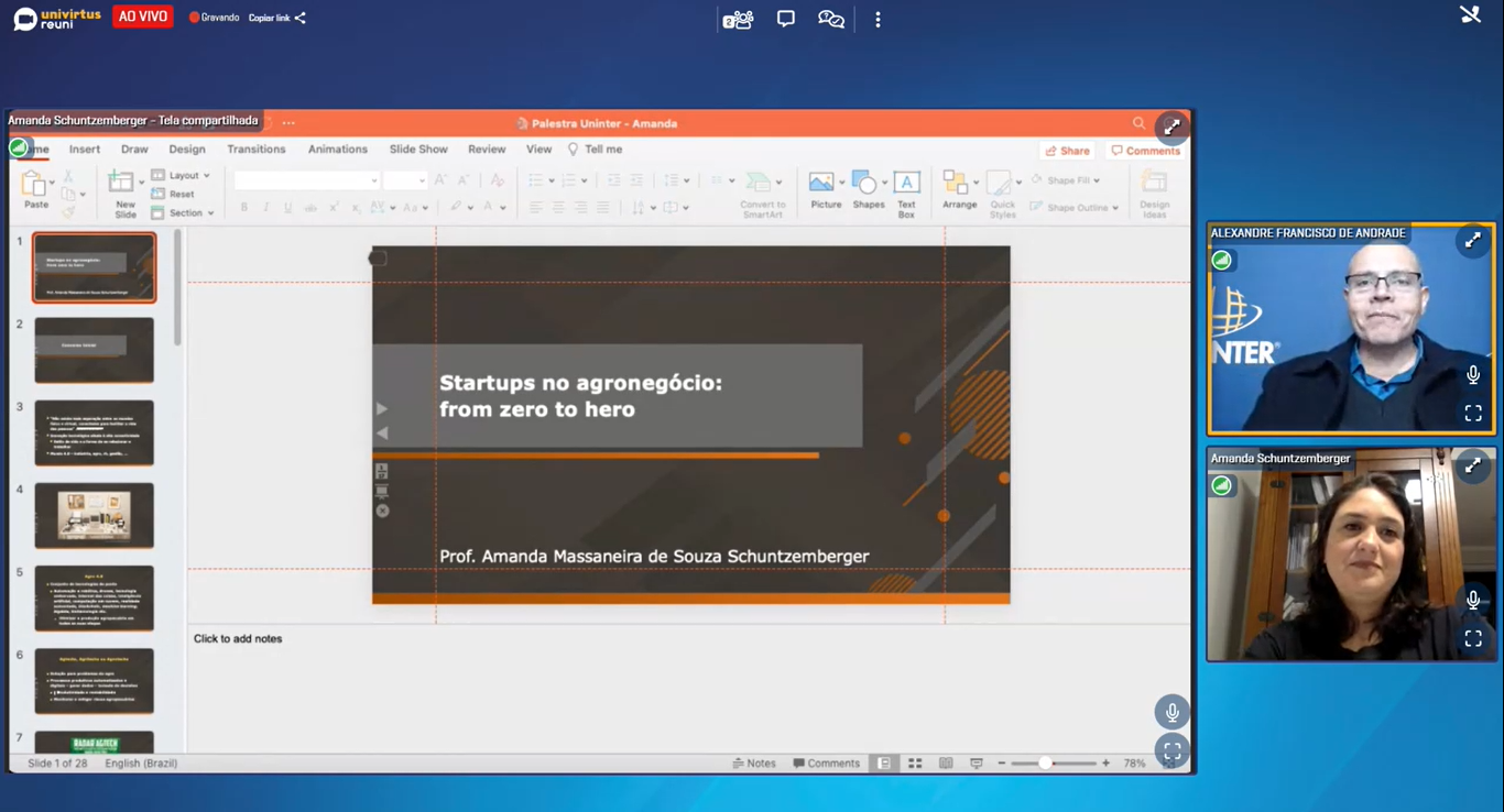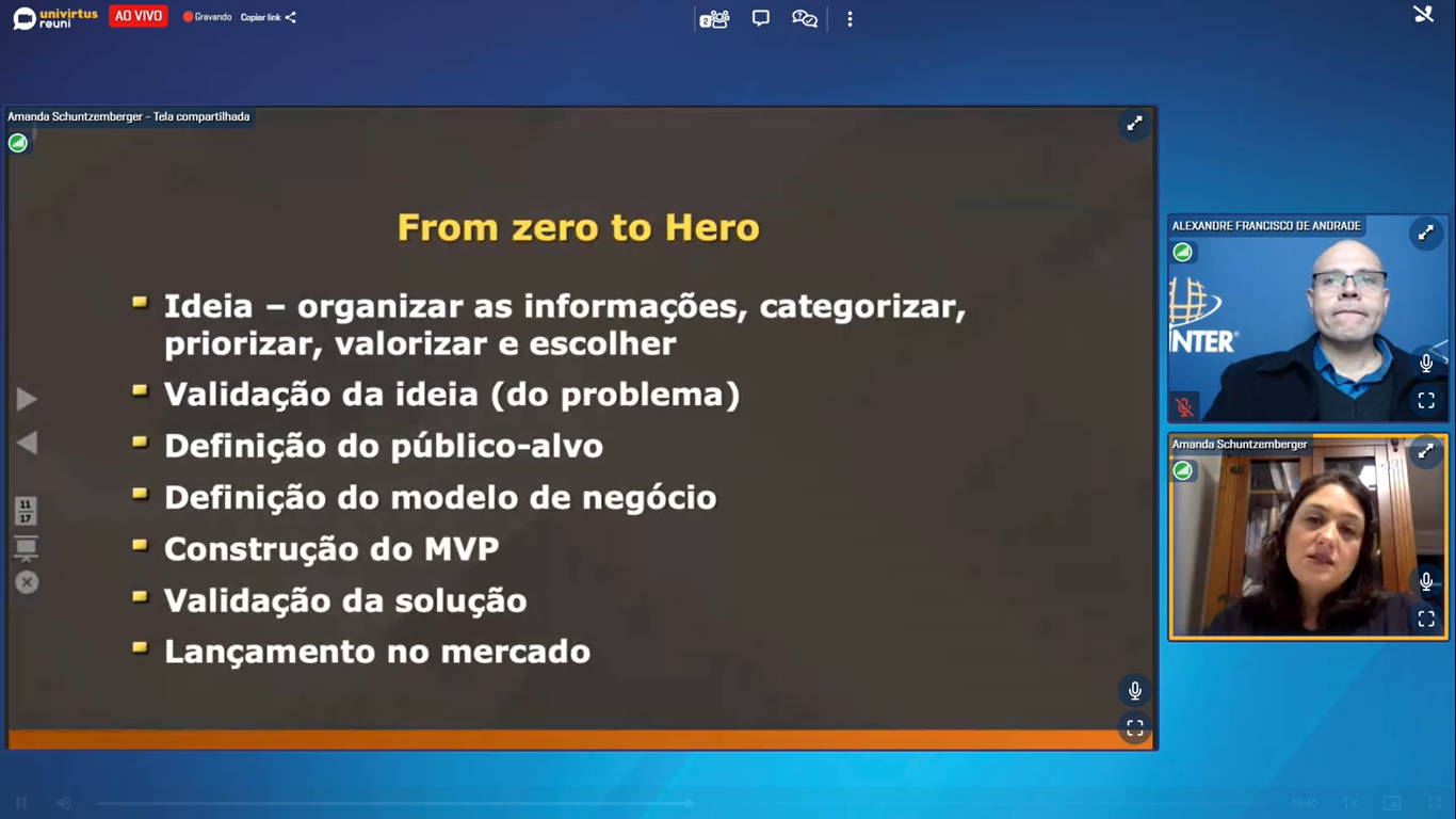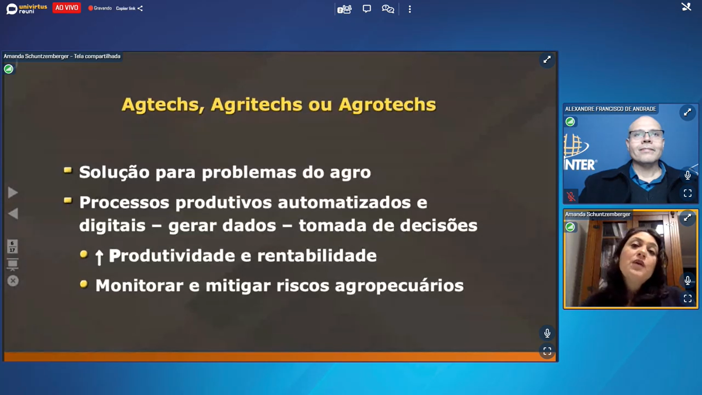 Amanda Schuntzemberger participou da live Startups do Agronegócio: From Zero to Hero, evento do programa Vem Saber, promovido pela área de pós-graduação em Negócios da Uninter. Transmitido pelo AVA Univirtus no dia 14.jun.2021 às 19h20, o evento contou com a mediação do coordenador dos cursos de pós-graduação da área de Negócios, Alexandre Francisco de Andrade.