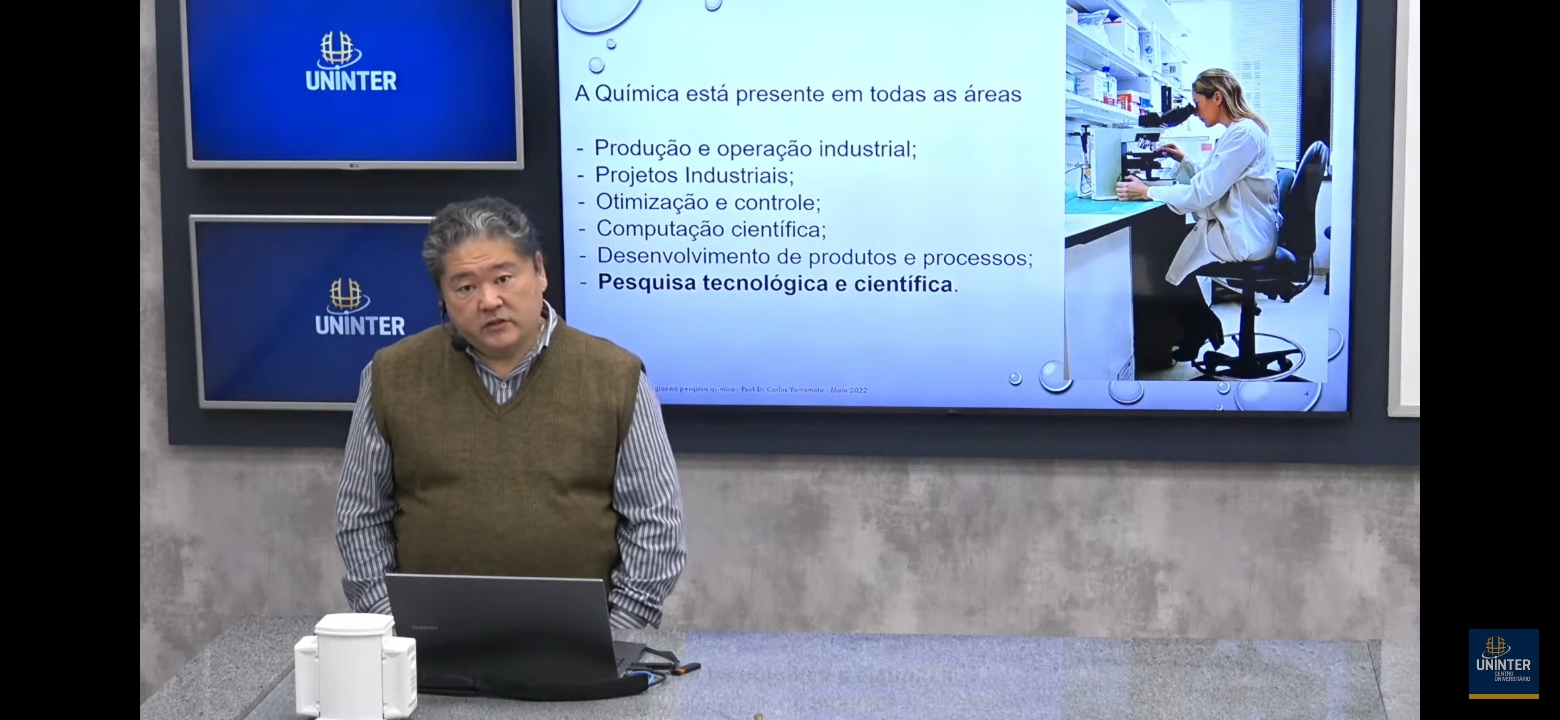 No segundo bloco, tivemos a presença do professor e doutor Carlos Itsuo Yamamoto que apresentou diversos equipamentos tecnológicos que estão disponíveis para realizar pesquisas na área da Química (Assista).