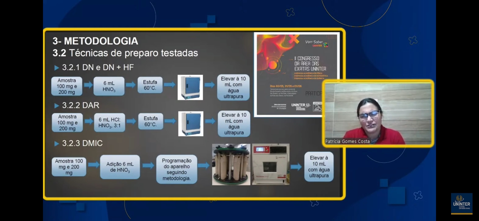 Os problemas enfrentados no ensino remoto durante a pandemia do Covid-19 foi o foco da pesquisa da estudante Nian Vieira Freire. Por fim, Patrícia Gomes apresentou pesquisa sobre o estudo de diferentes técnicas de digestão de amostras para determinação de elementos traços (Assista).