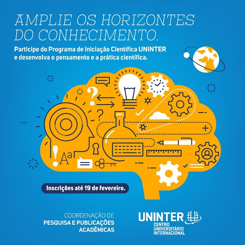 Estão abertas as vagas para as pesquisas do Programa de Iniciação Científica (PIC) deste ano, vinculadas aos cursos Uninter que têm projetos em andamento. As inscrições, iniciadas no dia 15.dez.2020, se estendem até o dia 19.fev.2021 para alunos da Uninter e de instituições externas, sejam candidatos a bolsistas ou voluntários.