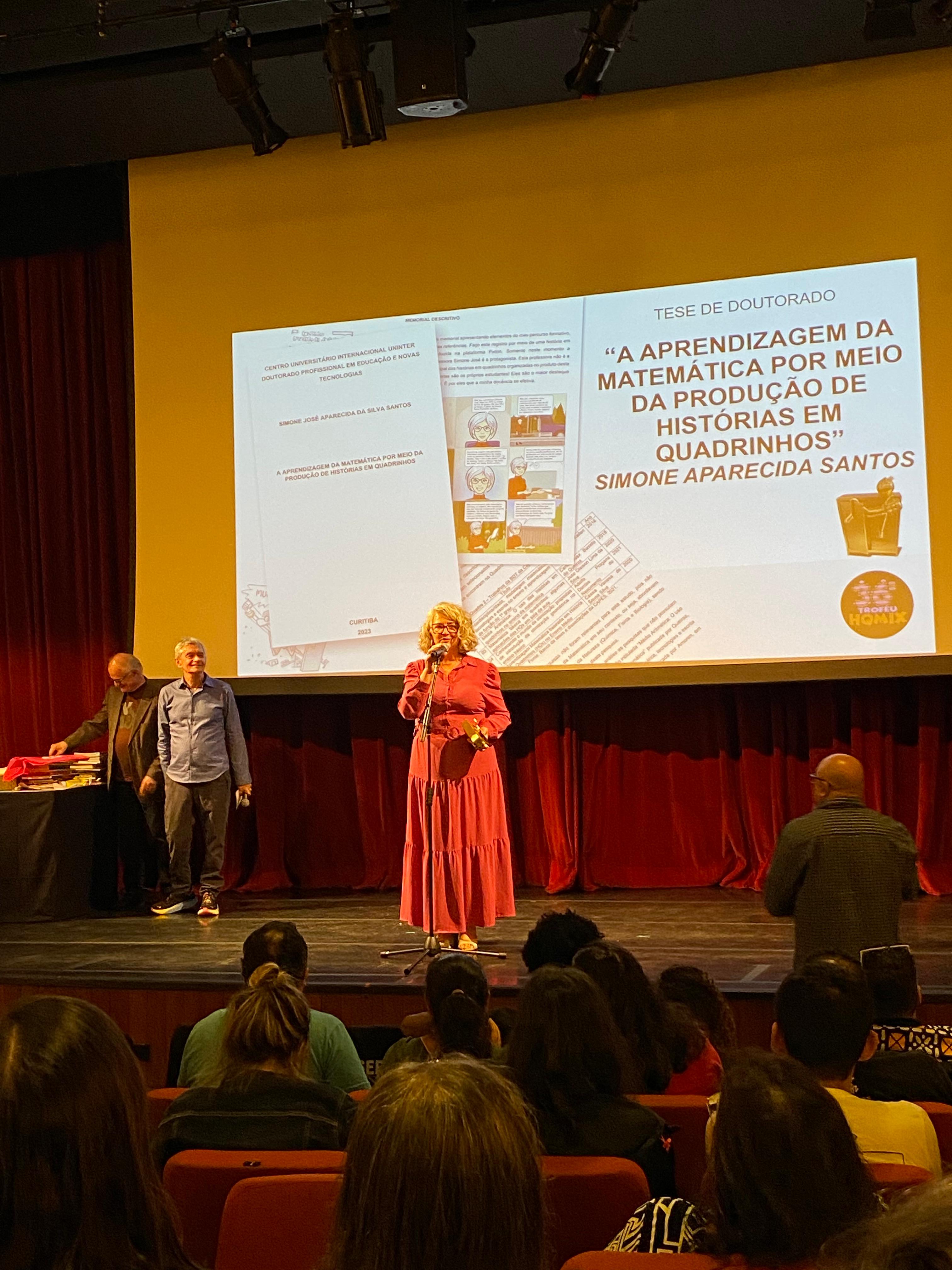 Durante as aulas de doutorado, Simone fez uma pesquisa bibliográfica sobre HQ no ensino de matemática, um estudo acerca de plataformas digitais para produção de histórias em quadrinhos e ensinou alunos dos anos finais do ensino fundamental a trabalhar com essas ferramentas. Ela destaca a importância do recebimento do troféu HQ Mix. “É um prêmio que reconhece e valoriza a produção de histórias em quadrinhos no Brasil. Fiquei muito feliz por minha tese ter sido escolhida”, comemora.