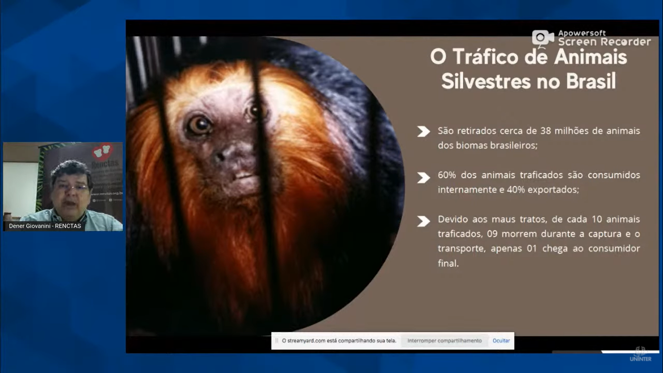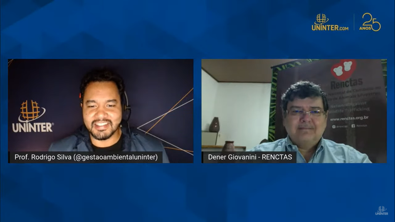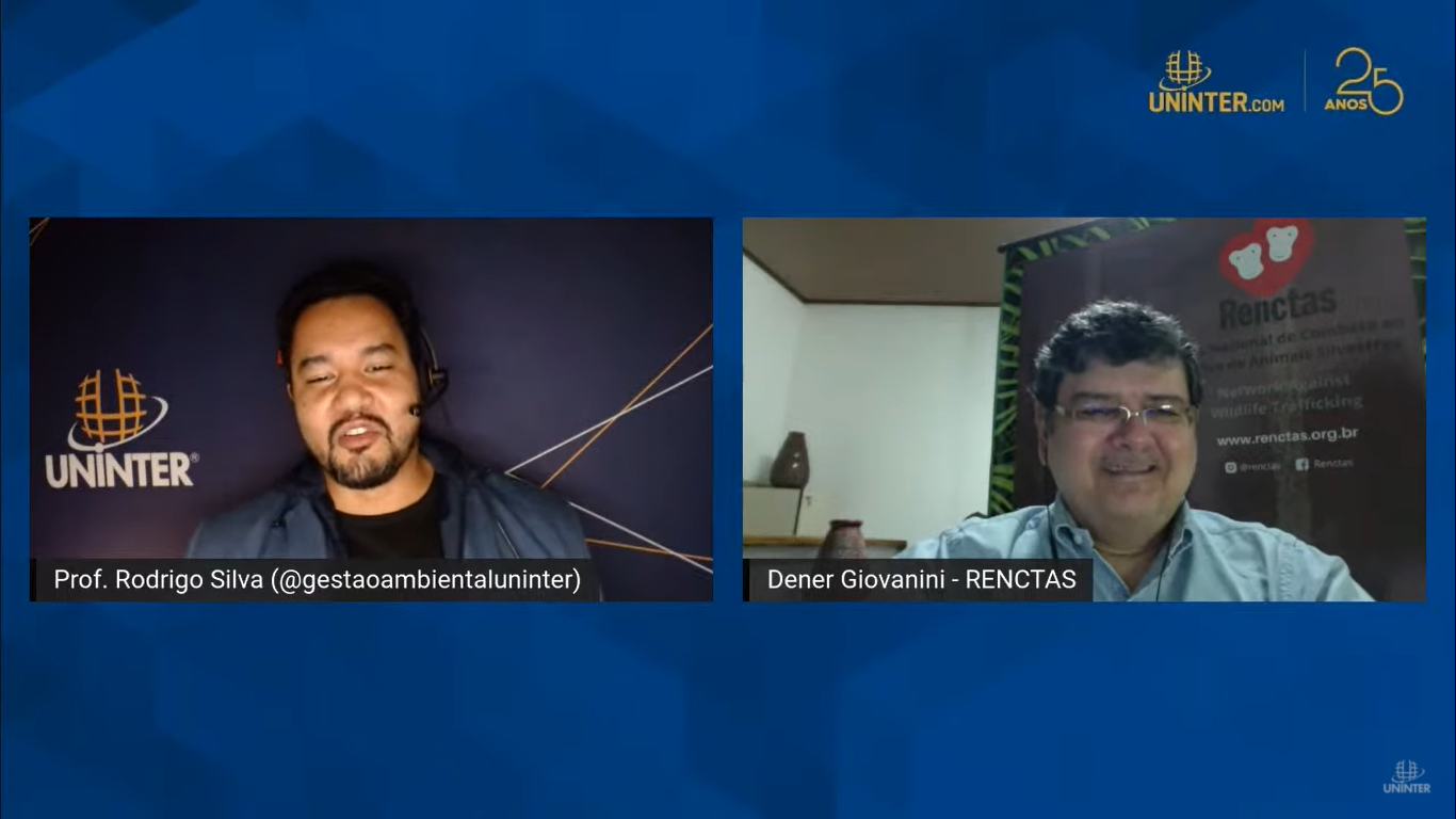 Dener conversou sobre o tema O tráfico de animais e as futuras pandemias durante a 2ª Maratona da sustentabilidade da Uninter. O evento, transmitido pelo Facebook e pelo canal do YoTtube da Uninter, contou com mediação do professor Rodrigo Silva, coordenador do curso superior de tecnologia em Gestão Ambiental.