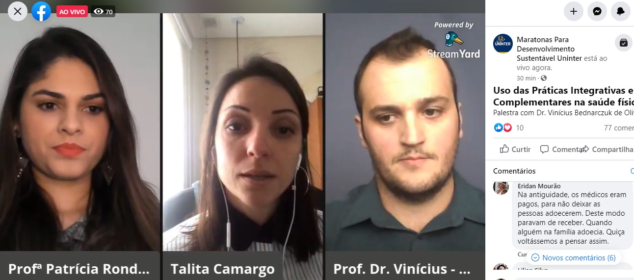 Vinícius e Talita falaram acerca do assunto em uma live da 1ª Maratona de Saúde da Uninter sobre o Uso das práticas integrativas e complementares na saúde física, mental e emocional, que aconteceu no dia 21.ago.2020. O bate-papo foi mediado pela professora Patrícia Rondon Gallina, da Escola Superior de Saúde da Uninter. A transmissão continua disponível para os interessados, na página do Facebook Maratonas para desenvolvimento sustentável Uninter.