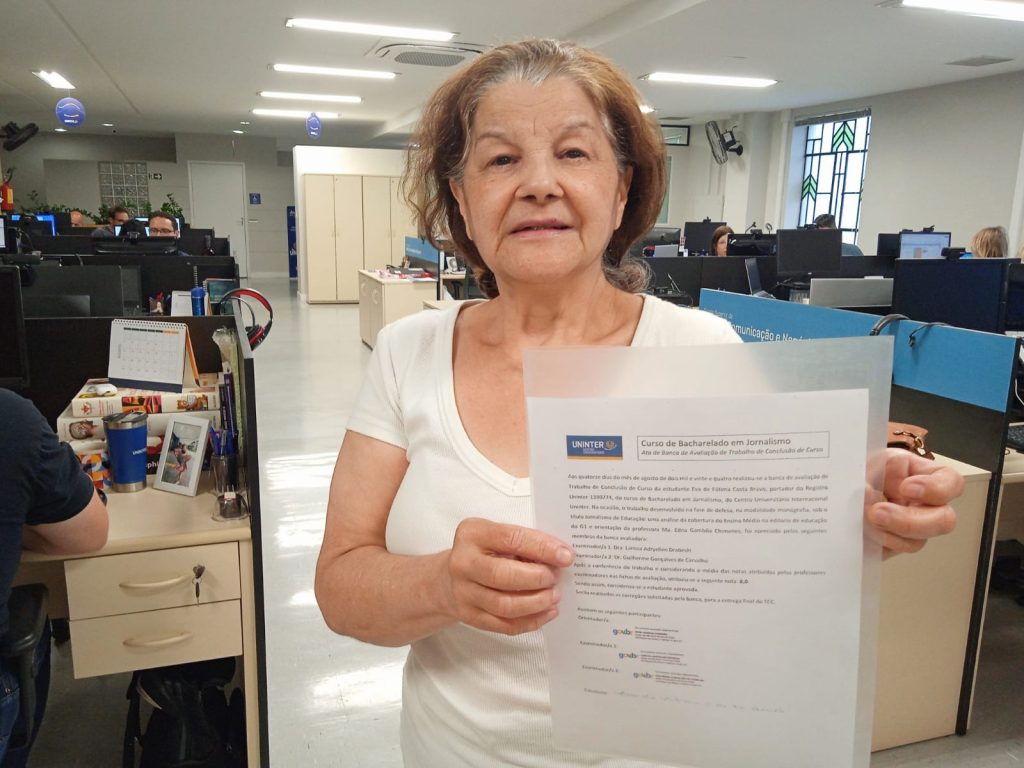 Eva sempre teve uma ligação muito forte com o jornalismo, pelo próprio hábito de se informar e utilizá-lo como ferramenta de ensino em sala de aula. Com 20 anos de serviços prestados à educação pública como professora de química, Eva de Fátima Costa Bravo, de 66 anos, nutriu durante toda sua carreira na docência uma particular afeição pela área da comunicação. Ao se aposentar, decidiu que era hora de acordar aquele sonho adormecido. Foi então que, em 2017, resolveu se inscrever no curso de Jornalismo da Uninter, no qual foi muito bem recebida.