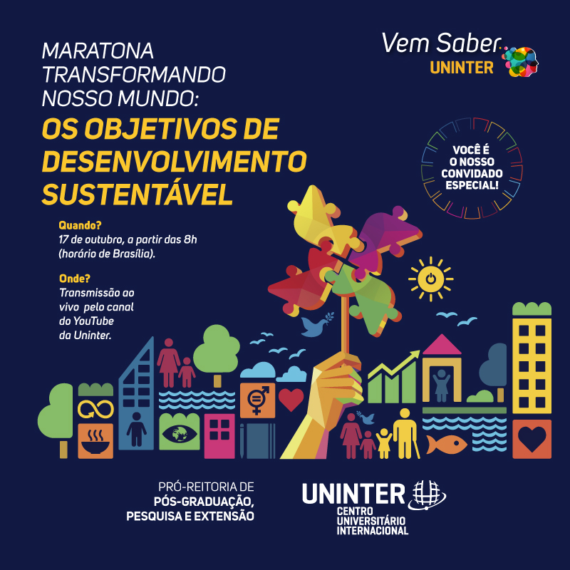 Neste sábado, 17.out.2020, acontece a Maratona Transformando o Mundo: os Objetivos de Desenvolvimento Sustentável, um evento que vai abordar os 17 Objetivos de Desenvolvimento Sustentável (ODS) definidos pela Assembleia Geral das Nações Unidas. O evento contará com 17 palestras, cada uma delas abordando um desses objetivos, que são: