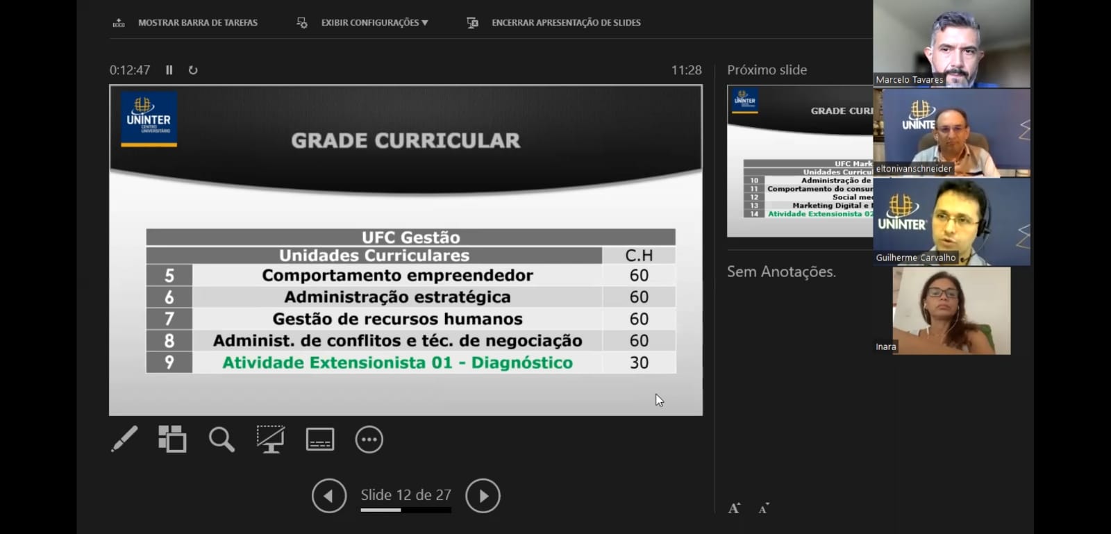 O diretor da Escola Superior de Gestão, Comunicação e Negócios, Elton Schneider, e o coordenador do curso de Comunicação Institucional, Guilherme Carvalho, apresentaram a graduação tecnológica a diretores do Conselho Federal de Profissionais de Relações Públicas (Conferp). O conselho é responsável pela regulação da profissão de Relações Públicas no Brasil, e os membros presentes na reunião virtual de 6.abr.22 receberam com entusiasmo a nova oferta da Uninter.