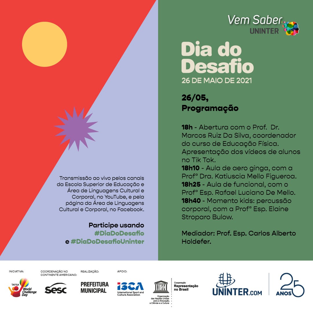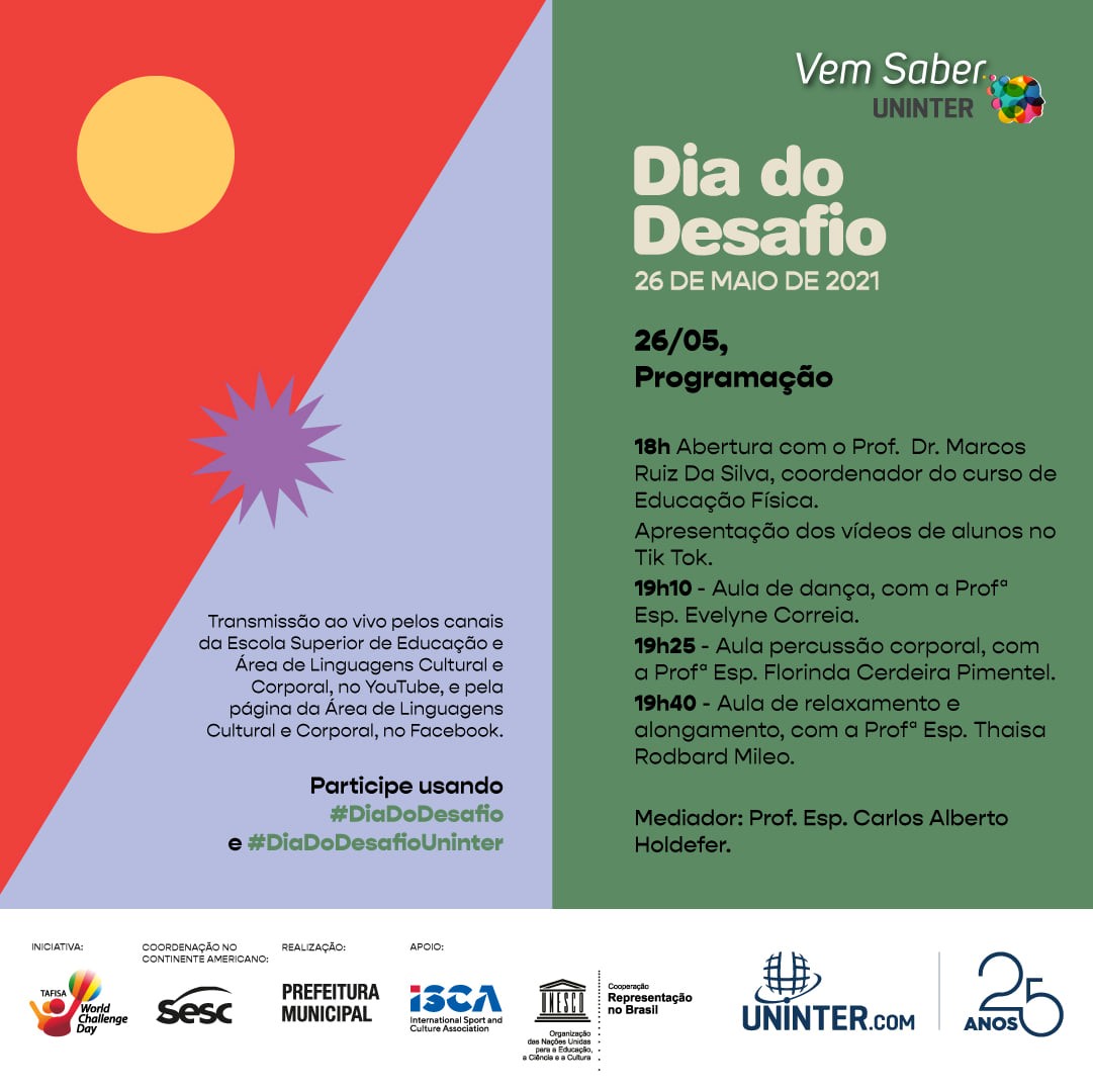 Há 27 anos o Dia do Desafio, realizado em todo 26 de maio, movimenta pessoas do mundo todo com a promoção de atividades físicas, para que a população tenha um estilo de vida mais ativo e saudável. A Uninter acredita nesta ação e, em busca conscientizar e motivar o maior número de pessoas, os professores da área de Linguagens Cultural e Corporal realizaram um evento virtual de quase duas horas, com as mais diversas práticas, entre dança, treinamento funcional, percussão corporal, relaxamento e até um momento kids.