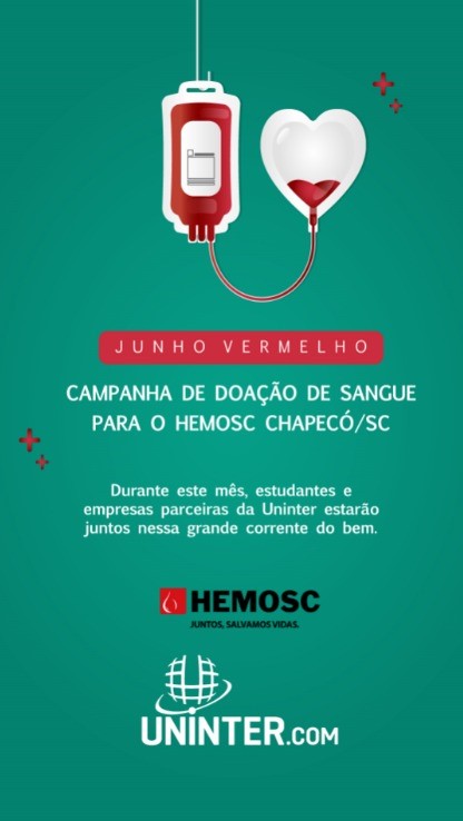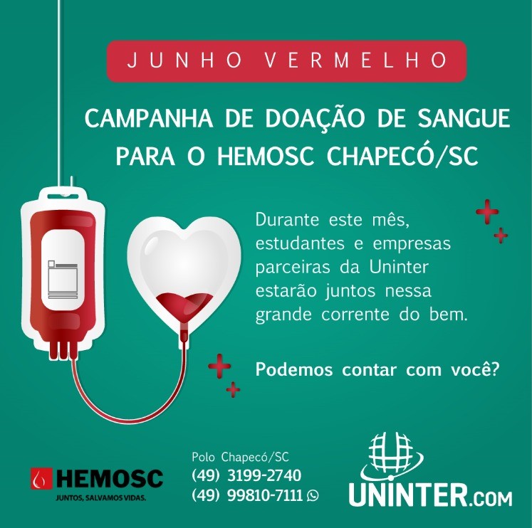 A campanha Junho Vermelho, marcada pelo Dia Mundial do Doador de Sangue no dia 14, se tornou ainda mais necessária após a explosão da Covid-19 pelo mundo. Com as superlotações dos hospitais, os níveis dos estoques de sangue caíram e a importância da solidariedade para salvar vidas só aumentou. Pensando nisso, o polo da Uninter em Chapecó (SC) realizou uma ação em parceria com o Centro de Hematologia e Hemoterapia de Santa Catarina (HEMOSC) no último mês.