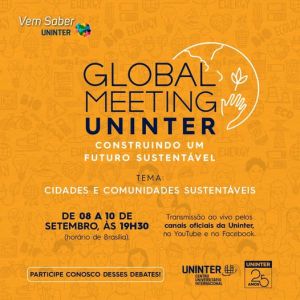 Em busca de conhecimento e ações práticas sobre um futuro mais sustentável, a Uninter em parceria com o seu Global Hub promovem entre os dias 8 e 10 de setembro, às 19h30, o Global Meeting. O evento, on-line e gratuito, reúne autoridades nacionais e internacionais, que debaterão soluções responsáveis, sustentáveis e seguras para as cidades até 2030, conforme estabelece o Objetivo do Desenvolvimento Sustentável 11 (ODS11), da Organização das Nações Unidas (ONU).
