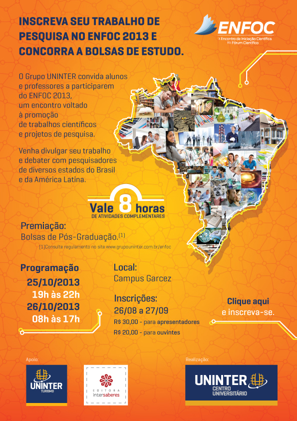A Pró-Reitoria de Ensino, Pesquisa e Extensão do Centro Universitário UNINTER publicou na última quinta-feira (10), o Edital de Aprovação dos trabalhos que serão apresentados nas bancas presenciais e a distância no X Encontro de Iniciação Científica (ENFOC).