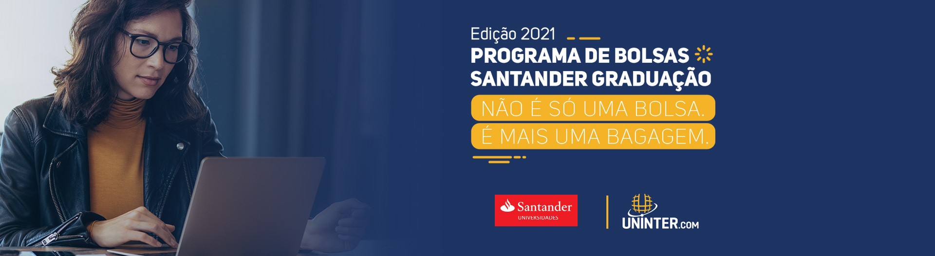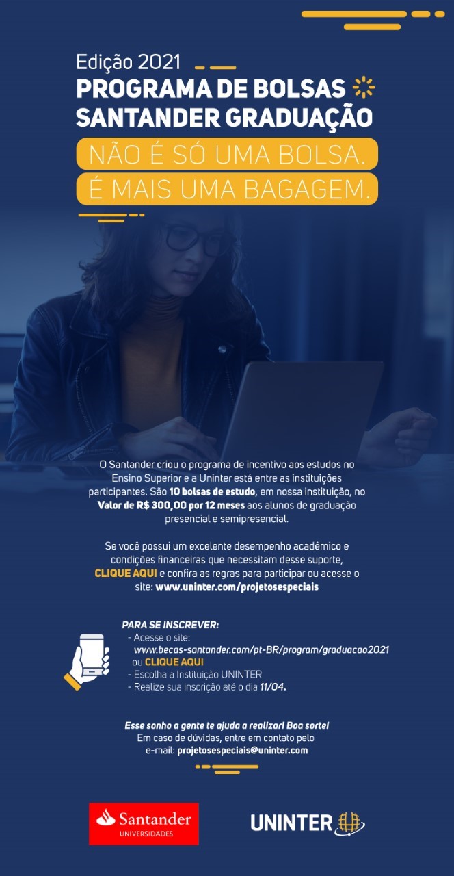 Em parceria com o banco Santander, a Uninter traz mais uma oportunidade de auxílio a seus estudantes. O programa Santander Graduação 2021 é um incentivo financeiro de R$ 300 por 12 meses, direcionado a alunos de graduação nas modalidades presencial e semipresencial. São dez bolsas oferecidas pelo centro universitário, com inscrições abertas até 11.abr.2021 neste link.
