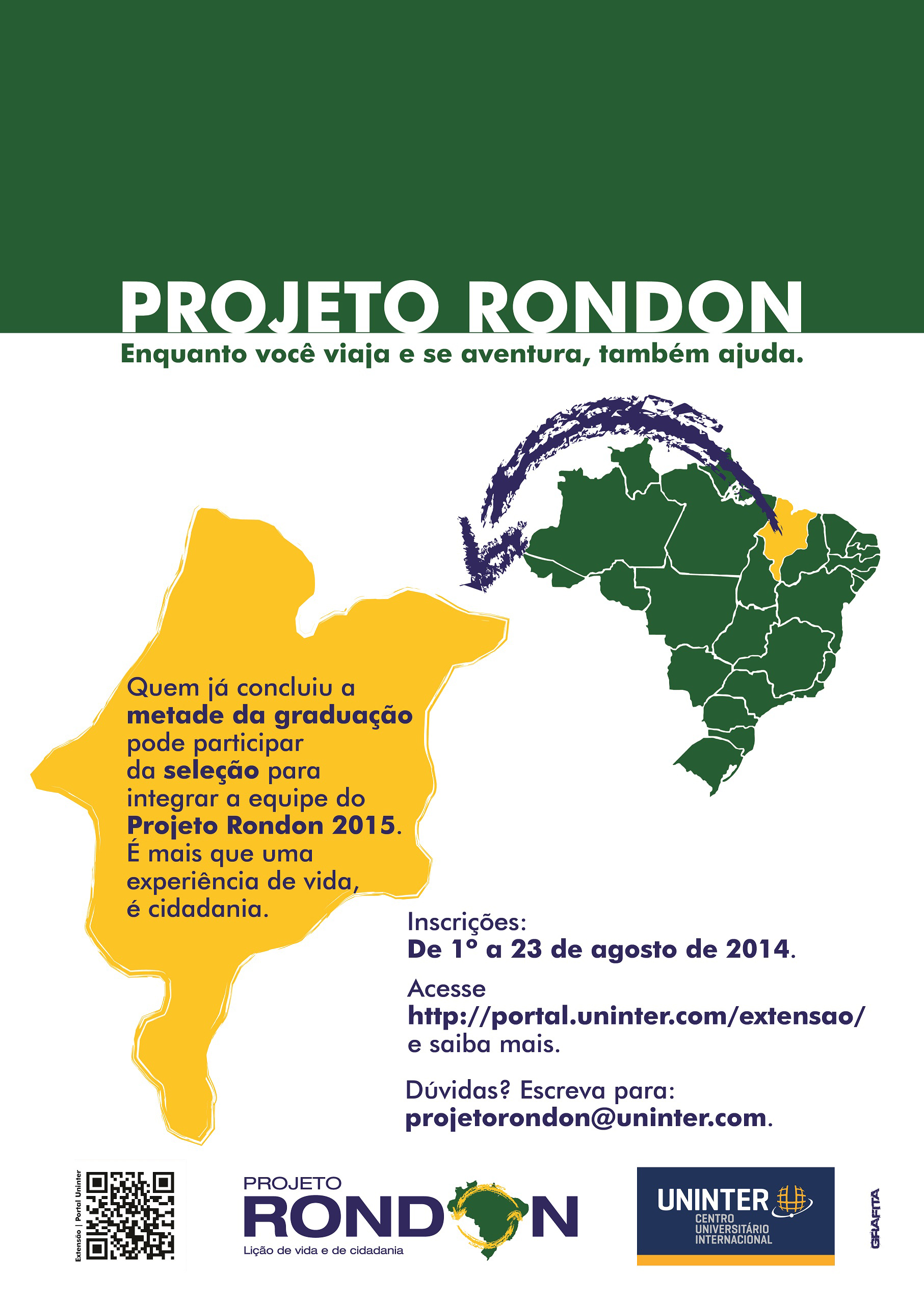 O Centro Universitário Internacional UNINTER teve seus projetos selecionados para participar da operação Jenipapo do Projeto Rondon em janeiro de 2015. Os professores Edilaine Cegan e Fernando Eduardo Kerschbaumer, com o apoio da Coordenação de Extensão e Assuntos Comunitários, formarão uma equipe com os alunos interessados em participar do projeto. O edital será publicado no início do segundo semestre letivo e somente alunos que estejam cursando a segunda metade do curso da graduação poderão se inscrever.