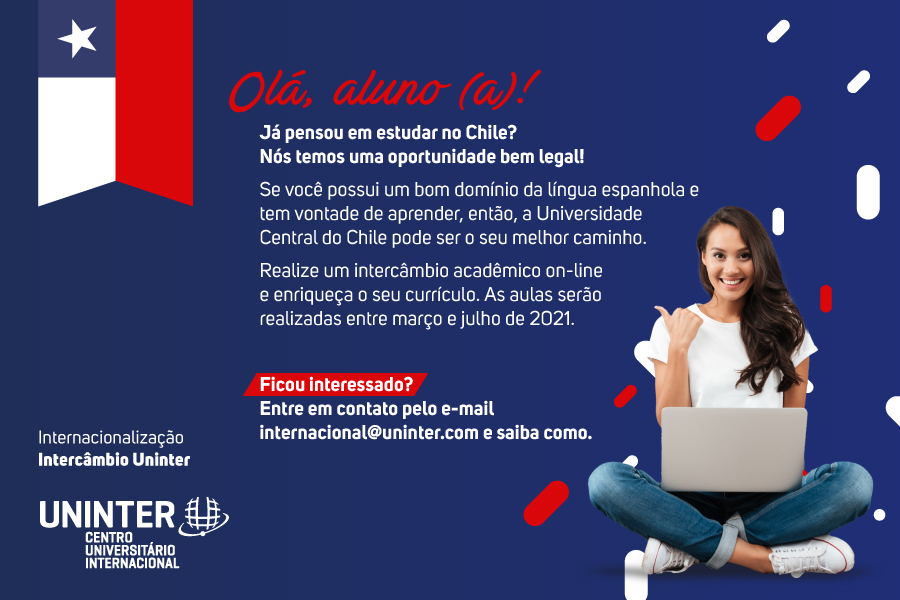 A Universidad Central de Chile (UCEN), instituição de ensino superior parceira da Uninter desde 2006, está recebendo estudantes para um programa totalmente virtual. Para se inscrever, é preciso falar espanhol e ter uma boa conexão com a internet. O custo? Essa é a melhor parte. Como o programa é virtual e a parceria da Uninter e UCEN implica em reciprocidade, o custo para participação no programa é ZERO. As aulas acontecerão entre março e julho de 2021. Por causa da intensa procura, as inscrições para o primeiro semestre do próximo ano já foram encerradas.