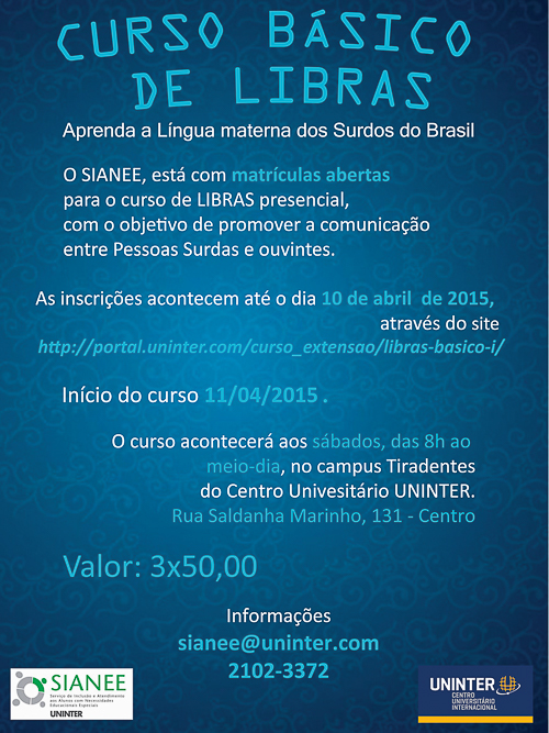 Estão abertas as inscrições para o curso Libras Básico I, promovido pelo Serviço de Inclusão e Atendimento aos Alunos com Necessidades Educacionais Especiais (SIANEE), do Centro Universitário Internacional Uninter.