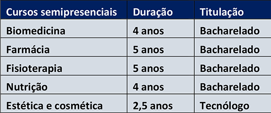 Na modalidade semipresencial, os novos cursos são o resultado da maturação de uma ideia e estudos de mais de quatro anos. Eles foram projetados em um formato para capacitar da melhor maneira os futuros profissionais. “O aluno conta também com o diferencial da personificação do conteúdo, onde ele pode escolher até 3 disciplinas a mais no seu curso para aprofundar os conhecimentos em uma área”, diz o coordenador da Escola Superior de Saúde, Cristiano Caveião.