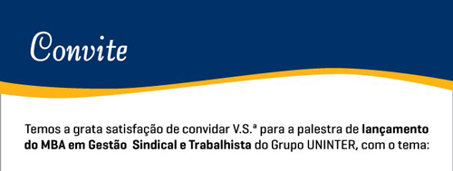 O Centro Universitário Uninter, juntamente com o Instituto Brasileiro de Pós-Graduação e Extensão (Ibpex), realiza no próximo dia 05 de junho, às 19h, no auditório do campus Garcez, o lançamento do MBA em Gestão Sindical e Trabalhista.