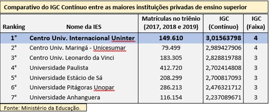 A Uninter  confirmou neste mês a sua liderança em qualidade de educação entre as maiores instituições privadas de ensino superior do país, segundo ranking do Índice Geral de Cursos (IGC) divulgado pelo Ministério da Educação (MEC) no último dia 23 de abril de 2021. A Uninter foi novamente classificada com a nota 4 no IGC, o que significa que manteve o conceito de excelência conquistado em 2019 e está entre as mais qualificadas instituições brasileiras de ensino.