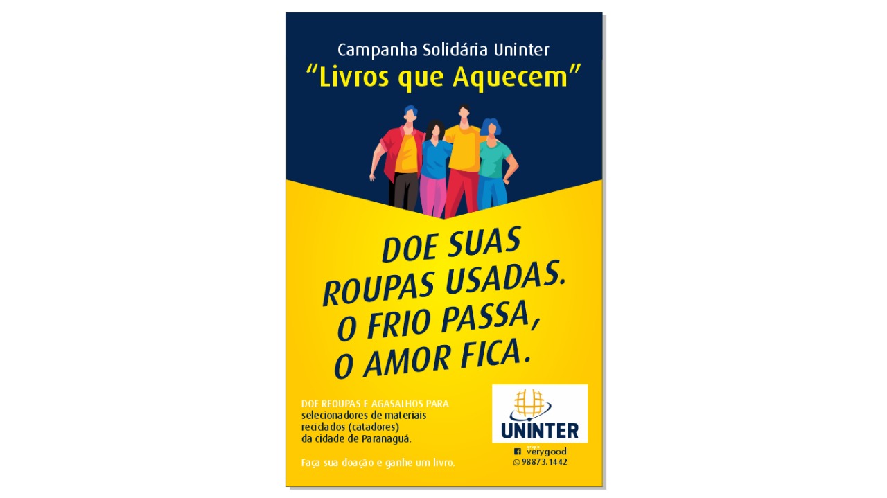 Com a chegada do inverno, as pessoas carentes são severamente atingidas pela queda nas temperaturas. Pensando nisso, diversas instituições promovem campanhas de arrecadação de roupas e cobertores para doar a quem precisa. O polo da Uninter na cidade de Paranaguá, litoral do Paraná, lançou a campanha “Livros que Aquecem”, no intuito de arrecadar doações para famílias de catadores de reciclados da cidade.