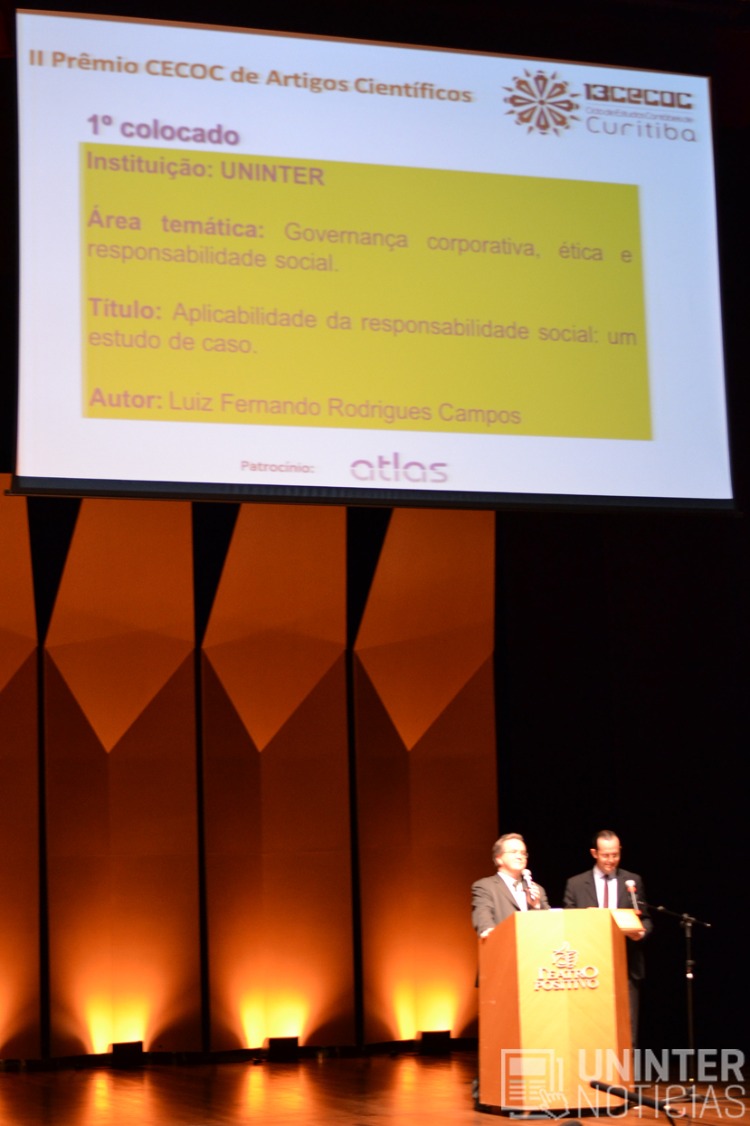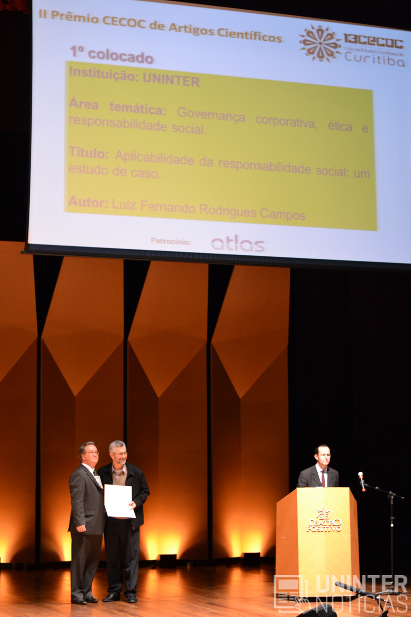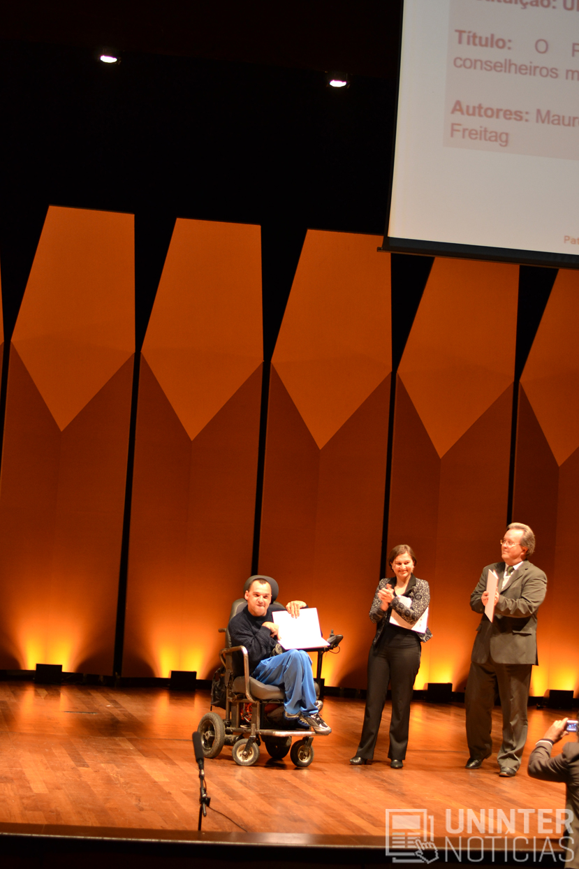 Em seguida veio a premiação para os melhores artigos científicos. O primeiro lugar na categoria Profissionais foi conquistado pelo professor dr. Luiz Fernando Campos, com o artigo Aplicabilidade da Responsabilidade Social: Um Estudo de Caso. Como segundo colocado na categoria Estudantes e Egressos estava Mauro Sérgio Langowski e a orientadora Viviane da Costa Freitag, com o trabalho O Processo Decisório na visão dos Conselheiros Municipais de Saúde de Curitiba.
