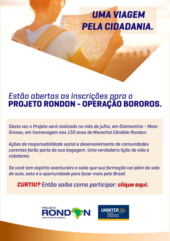 Acesse: http://portal.uninter.com/extensao-projeto-rondon/ ou mande e-mail para [email protected]