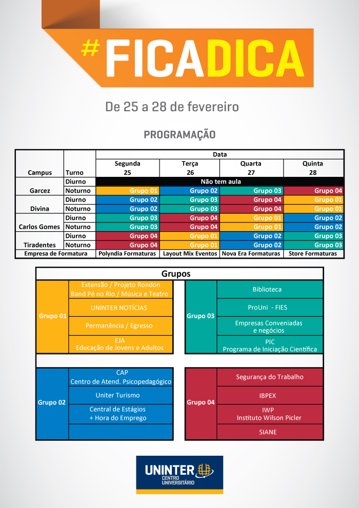 De 25 a 28 de fevereiro, alunos e visitantes poderão participar da Mostra #FICADICA UNINTER 2013, cujo objetivo é apresentar os serviços prestados pelo UNINTER. “Queremos divulgar os serviços que o Centro Universitário UNINTER oferece aos alunos e a comunidade em geral. Serviços estes que contribuem para a formação pessoal, profissional e cultural de todos. O visitante também poderá, por exemplo, encontrar um estágio, ver possibilidades de alavancar a carreira por meio de cursos de pós-graduação e verificar diferentes formas de agregar conhecimentos ao currículo, ser orientado quanto ao Financiamento Estudantil (Fies). Além de ser apresentado para o setor de Permanência e Egressos. Esta é a principal função da Mostra”, explica Cláudia Pampolini, Coordenadora da Extensão UNINTER.