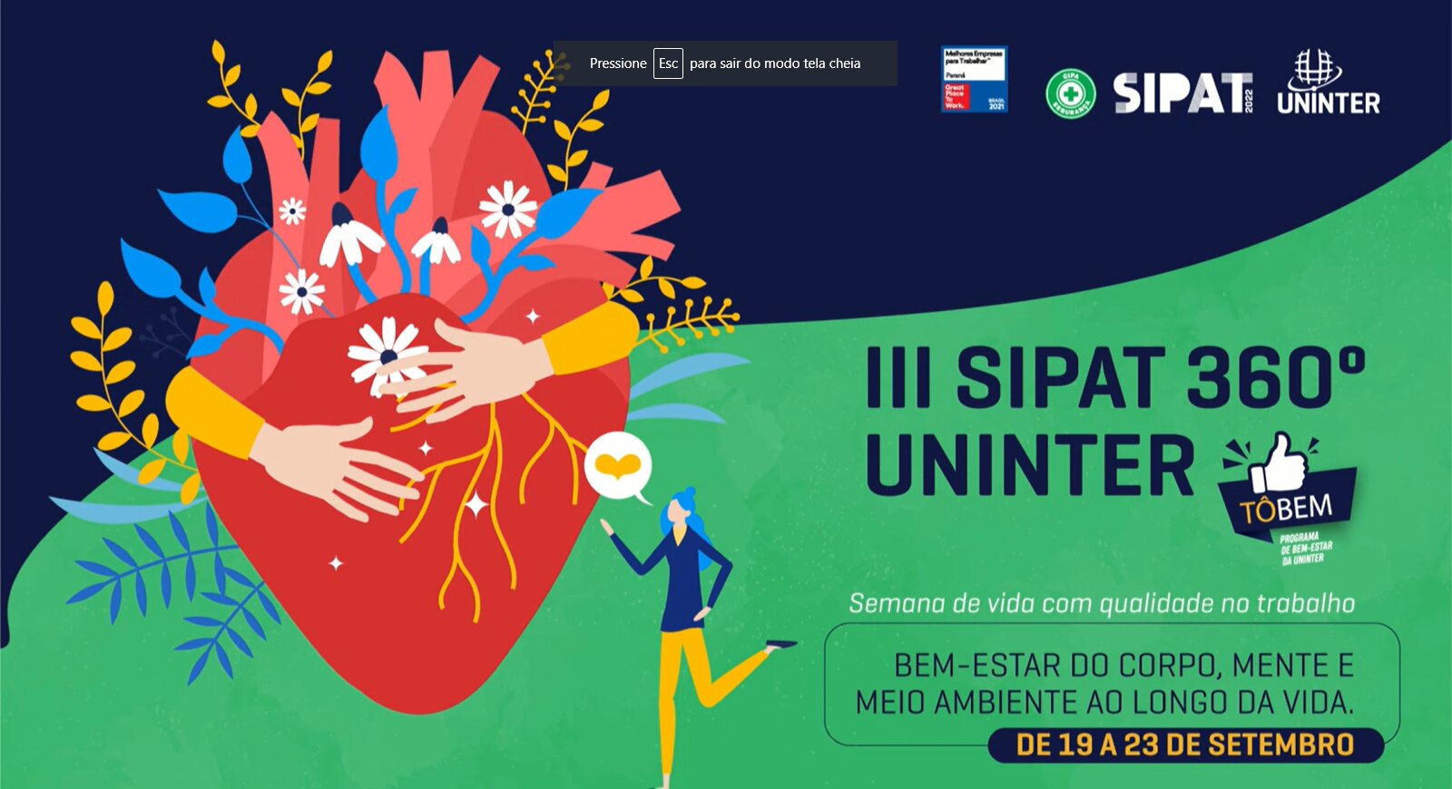A Semana Interna de Prevenção de Acidentes do Trabalho (SIPAT) da Uninter foi realizada nos dias 19 a 23 de setembro de 2022 com o tema “Bem-estar do corpo de da mente e meio ambiente ao longo da vida”.