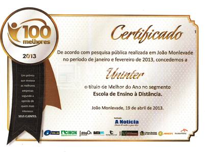 O Centro Universitário UNINTER, recebeu no dia 19 de abril, o Prêmio 100 Melhores do Ano, no segmento Escola de Ensino à Distância. A disputa, realizada pelo jornal A Notícia, acontece anualmente em João Monlevade (MG), e destaca as melhores empresas segundo a opinião dos clientes.