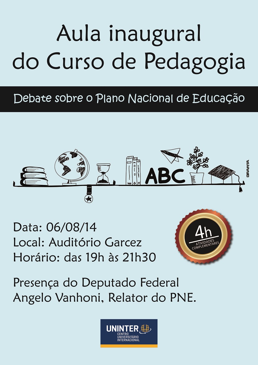 Será realizada no dia 06 de agosto, uma aula inaugural do curso presencial de Pedagogia do Centro Universitário Internacional UNINTER. Estará presente o deputado federal, Ângelo Vanhoni, relator do Plano Nacional de Educação (PNE), com uma breve palestra sobre o tema. Logo após, será aberto um debate com o público participante para a compreensão sobre as perspectivas para a educação brasileira a partir da aprovação do PNE. A aula acontecerá das 19h às 21h30, no auditório do Campus Garcez (Rua Luiz Xavier, 103) .