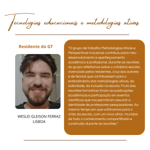 “O grupo de trabalho Metodologias Ativas e Perspectivas Inclusivas contribuiu para meu desenvolvimento e aperfeiçoamento acadêmico e profissional, durante as reuniões do grupo refletíamos sobre o cotidiano escolar, vivenciado pelos residentes, a luz dos autores e de teorias que contribuíssem para o entendimento das metodologias ativas, da ludicidade, da inclusão na escola. Fruto das reuniões formativas foram as publicações acadêmicas e participação em eventos científicos que nos permitiram assumir a identidade de professores-pesquisadores. Ao mesmo tempo em que voltávamos para o chão da escola, com um novo olhar, munidos de todo o conhecimento compartilhado e construído durante as reuniões.”