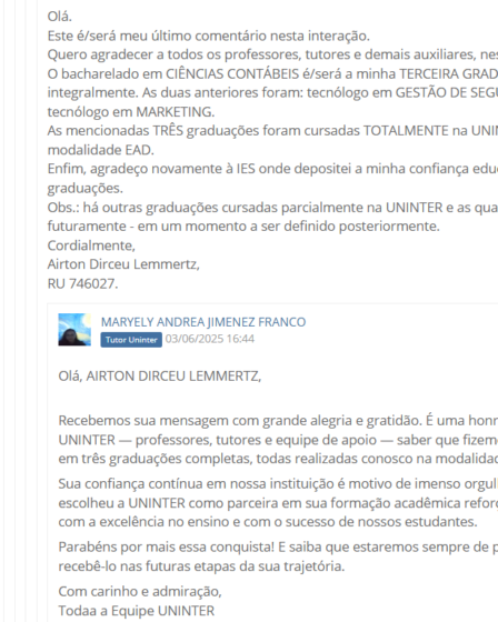 Quero agradecer a todos os professores, tutores e demais auxiliares, neste curso. O bacharelado em CIÊNCIAS CONTÁBEIS é a minha TERCEIRA GRADUAÇÃO concluída integralmente. As duas anteriores foram: tecnólogo em GESTÃO DE SEGURANÇA PRIVADA e tecnólogo em MARKETING. As mencionadas TRÊS graduações foram cursadas TOTALMENTE na UNINTER. As três na modalidade EAD. Enfim, agradeço novamente …