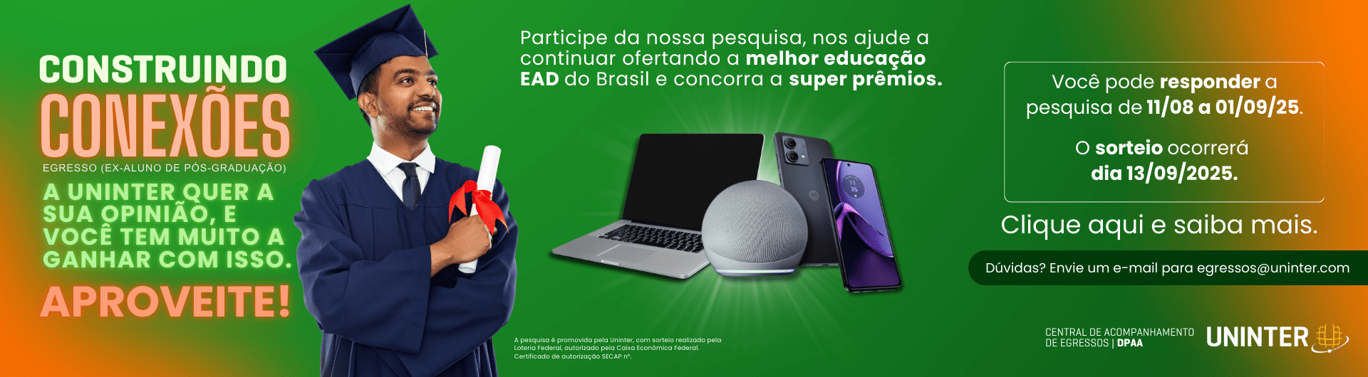 O Centro Universitário Internacional – UNINTER, por meio da Central de Acompanhamento de Egressos, convida você, formado(a) em um de nossos cursos de pós-graduação, a participar da Pesquisa de Egressos 2025.